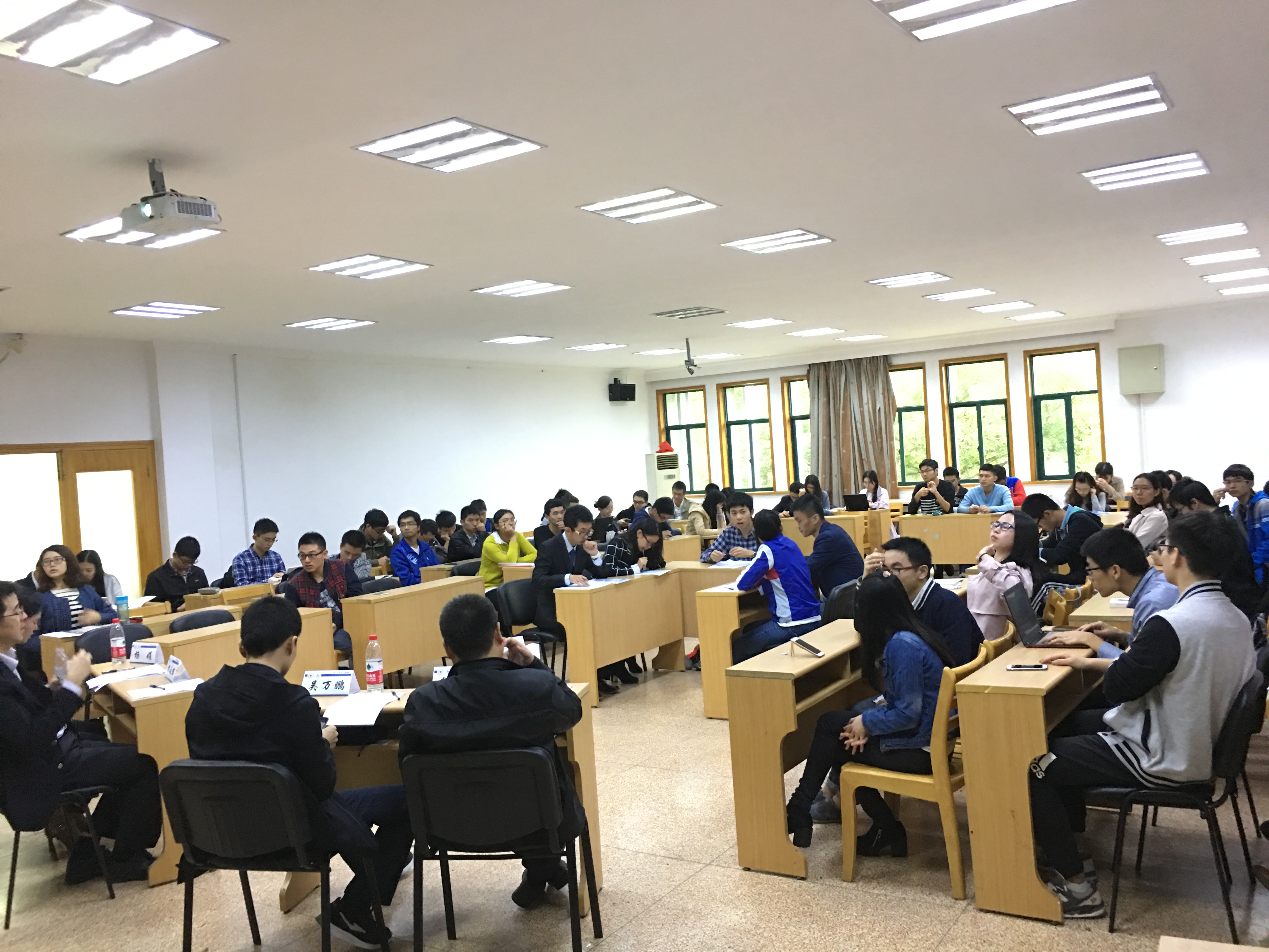 比赛在14:30准时开始,首先是各位嘉宾对其代表公司的介绍以及个人职场、面试经验的分享,其中两位嘉宾还非常用心地准备了PPT。然后嘉宾对五位同学的简历进行了一个简短地评述,让同学们了解HR们在面试过程中喜欢看的简历形式和内容。接着正式进入了我们此次大赛的主要环节,也就是第一轮无领导小组讨论面试,5位同学都积极地发言讨论,阐述自己的观点。讨论结束之后嘉宾对他们进行了针对性的点评与指导,让同学们了解到无领导小组讨论各种需要注意的地方。在四位嘉宾讨论后,选出三位表现优秀而且具有代表性的同学进入第二轮多对一面试。嘉宾讨论时,现场进行了抽奖环节,随机选出了三位幸运观众送出我们的小礼品,现场气氛十分活跃。抽奖过后,就是此次活动的第二轮面试,嘉宾分别对三位晋级的参赛者进行提问,选出最后的优胜者进行颁奖。