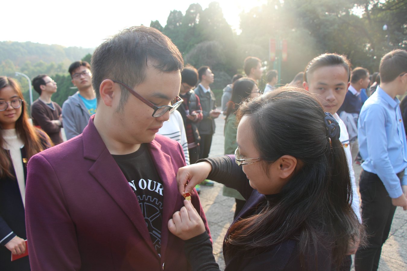 参观结束后,宣誓仪式于烈士纪念碑前正式开始。仪式开始,全体肃立,奏唱国歌,全体行注目礼;随后由两位新发展党员代表向革命烈士敬献花圈,全体向革命烈士三鞠躬,表达对革命烈士的景仰和感激之情;礼毕,由主持人宣读beat365平台唯一官网2016年秋冬学期新发展党员名单,并由新发展党员代表肖翔匀同志领誓,新党员们齐举右拳,庄重宣读入党誓词;随后由新发展党员代表肖翔匀同志发言,希望大家恪守誓言、律己奉公,做一名合格的共产党员;最后由学院陈敏老师、卢俏老师和李涛老师为新党员们佩戴党徽和发放党章,每一位新党员都在党旗下拍照,纪念这一神圣的时刻。