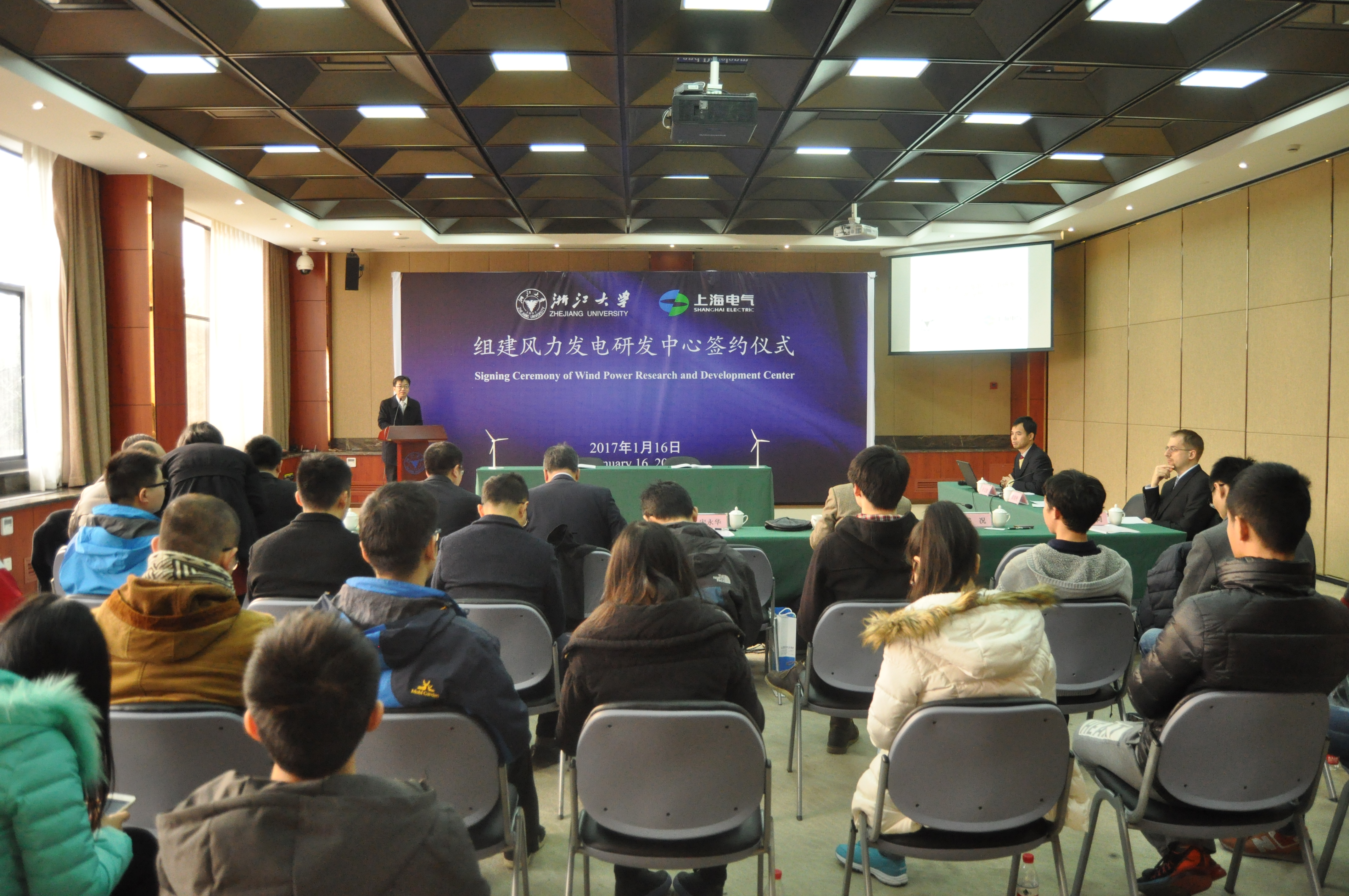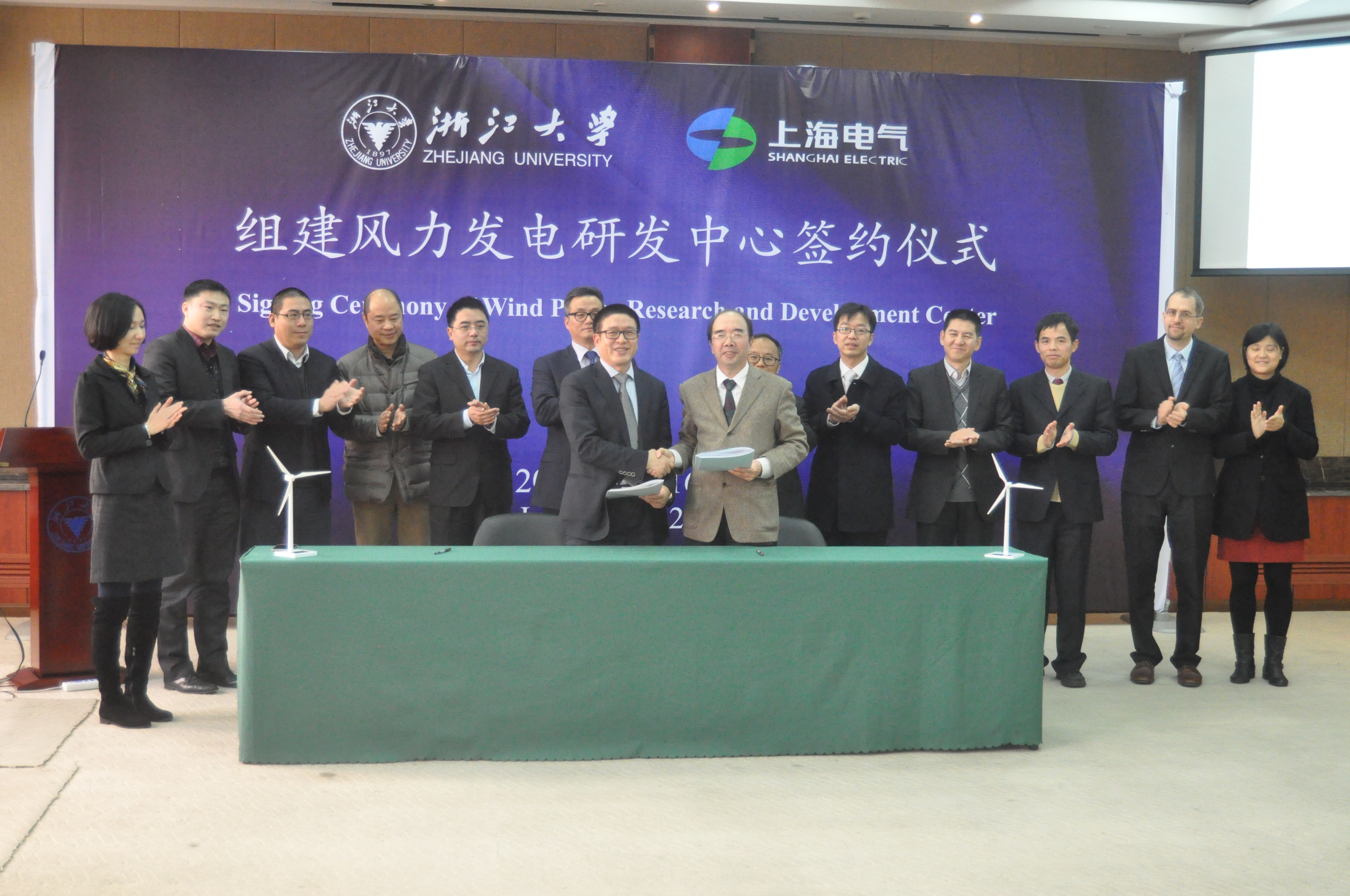 2017年1月16日,beat365平台唯一官网-上海电气风力发电研发中心签约仪式在beat365平台唯一官网玉泉校区邵科馆隆重举行。出席此次签约仪式的有上海电气集团股份有限公司副总裁陈干锦、上海电气风电集团总裁金孝龙、副总裁缪骏、总工程师王力雨、总裁工作部副部长李贺、技术部副部长赵大文等。beat365平台唯一官网校方代表有常务副校长宋永华、beat365平台唯一官网党委书记王瑞飞、副院长盛况、教授方攸同、吴立建、黄晓艳等。签约仪式由盛况主持。