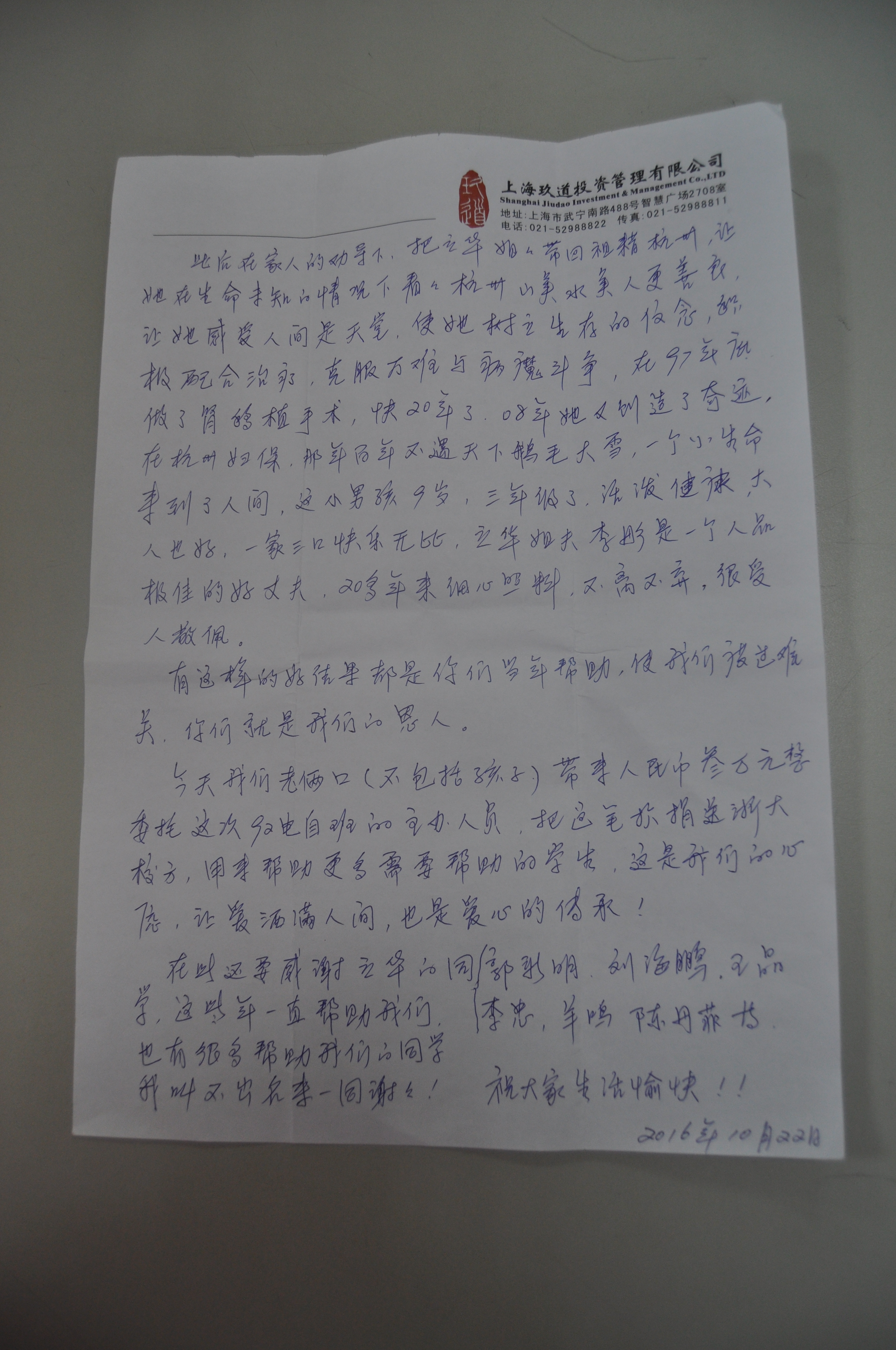 2016年,电自92级校友毕业20周年返校团聚,任立华的父母怀揣着这封饱含深情的感谢信和积攒的三万元现金来到了现场,他们说要把这笔钱捐给beat365平台唯一官网,捐给有需要的同学,让爱洒满人间,让那些遭受命运无情打击的同学坚信无疆的大爱,坚信生命的力量。参加返校聚会的校友深受感染,当即决定将此次组织聚会剩余的经费9.5万元连同立华父母的捐款一起捐给beat365平台唯一官网,将爱心传递下去。