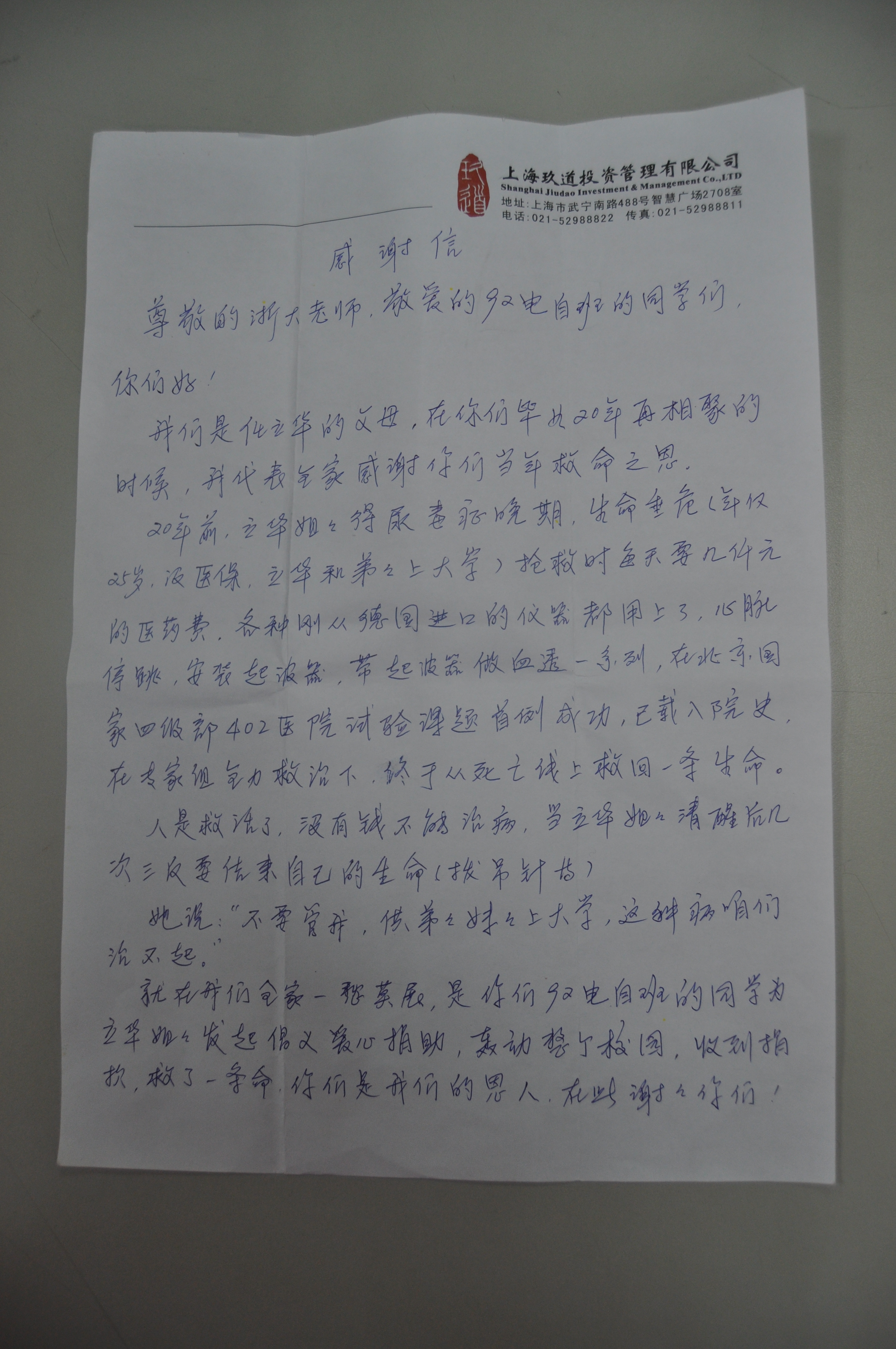 这是一封“迟到”的感谢信,朴实无华的语言,娓娓道来一个关于生命、关于爱的故事。二十年前,我院92级电自班同学任立华的姐姐罹患尿毒症,每天动辄上千元的医疗费用对于本就不宽裕的家庭而言无疑是雪上加霜。立华姐姐在清醒的时候,甚至想过结束自己的生命,她说:“不要管我,供弟弟妹妹上大学,这种病咱们治不起”。在全家为高昂的费用一筹莫展之际,92级电自班的同学雪中送炭,发起了爱心捐助倡议。一时间,爱的暖流汇聚求是园,老师同学们纷纷慷慨解囊,筹集了捐款近三万元。多年来,同学们与立华家保持了密切的联系,在困难中伸出援手,在绝望中带去希望,不仅在经济上继续帮助立华姐姐,更在精神上激励她勇敢地走下去,汇聚涓细的温暖,融化心灵的坚冰。
