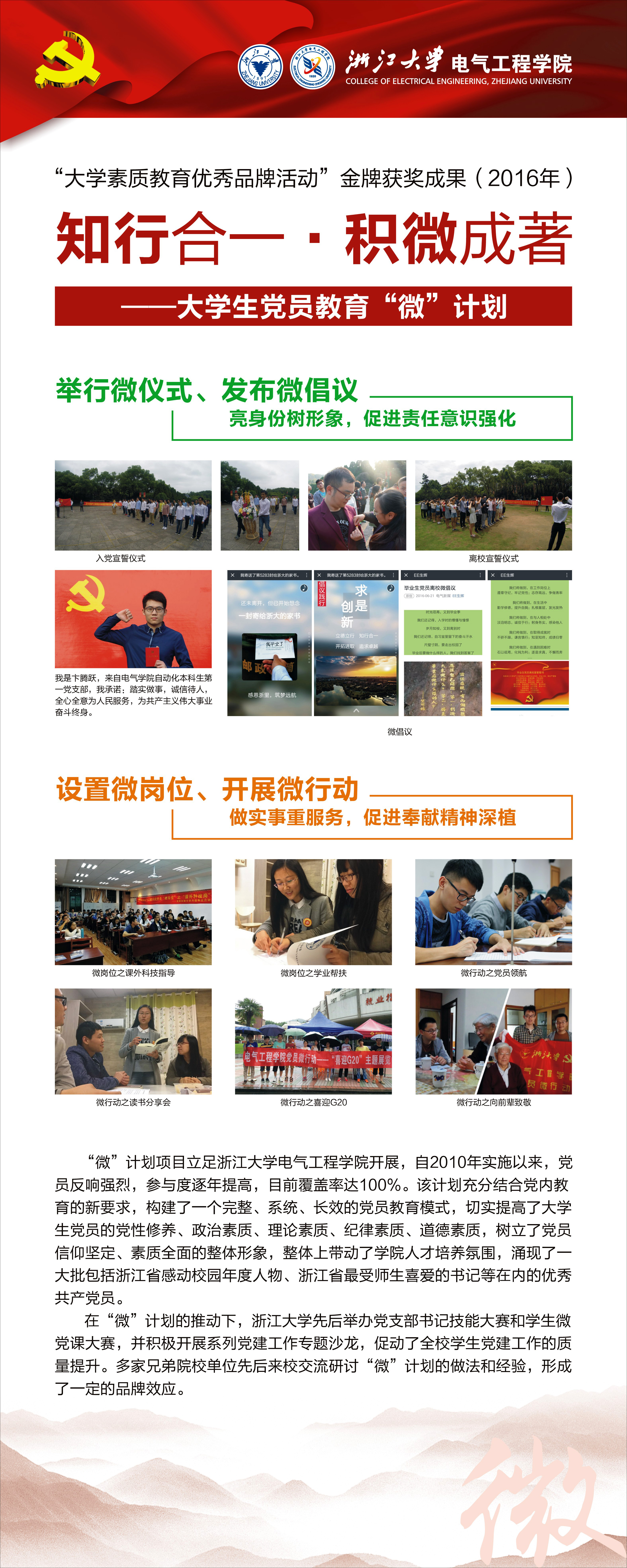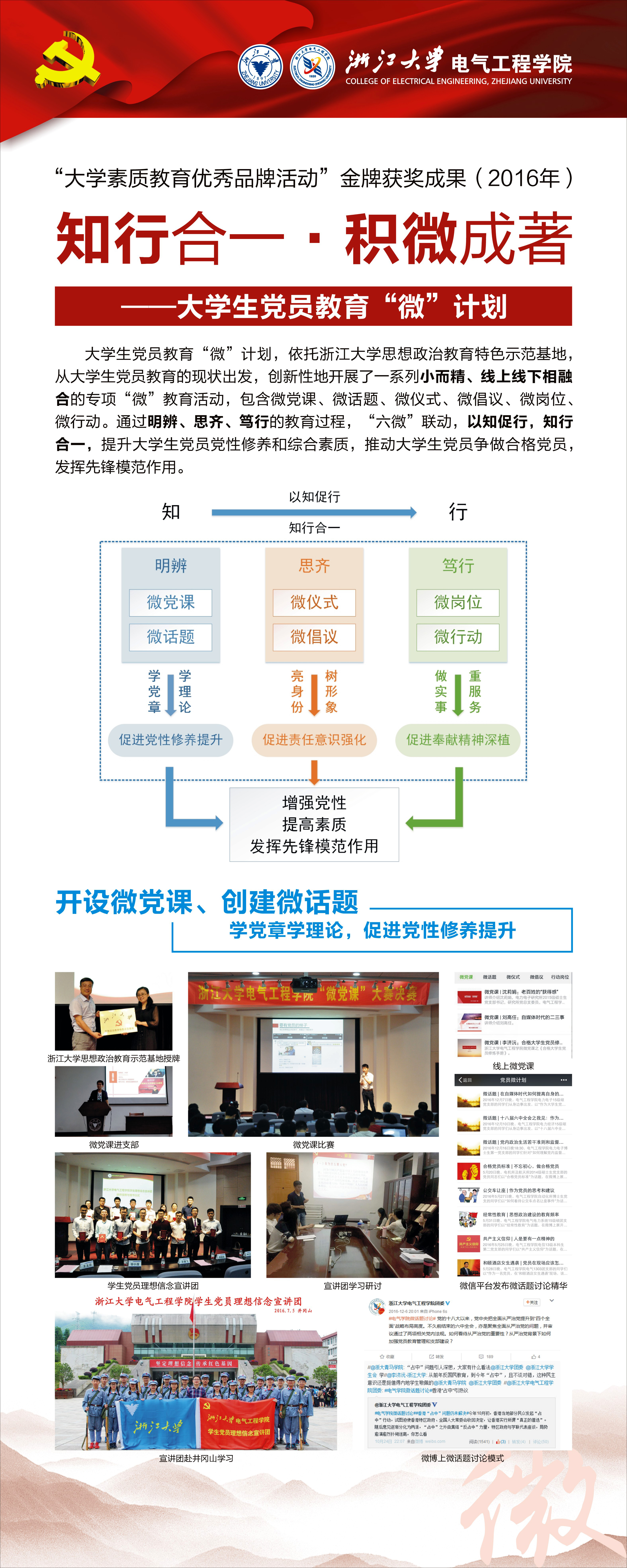 大学生党员教育“微”计划,依托beat365平台唯一官网思想政治教育特色示范基地,从大学生党员教育的现状出发,创新性地开展了一系列小而精、线上线下相融合的专项“微”教育活动,包含微党课、微话题、微仪式、微倡议、微岗位、微行动。通过明辨、思齐、笃行的教育过程,“六微”联动,以知促行,知行合一,提升大学生党员党性修养和综合素质,推动大学生党员争做合格党员,发挥先锋模范作用。