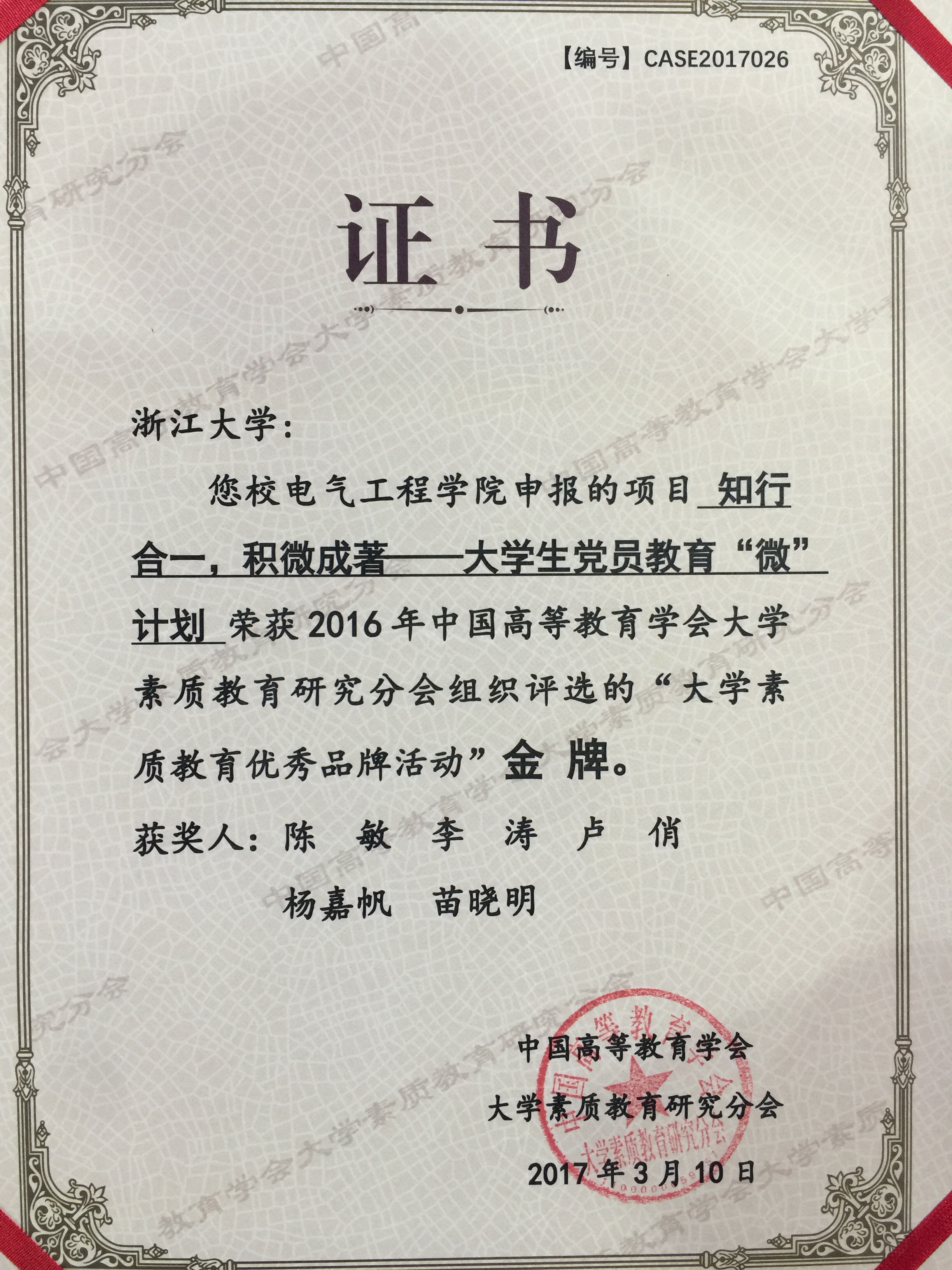 3月10日,中国高等教育学会大学素质教育研究会分会2017年会暨第六届大学素质教育高层论坛在南京农业大学举行。会上对2016年“大学素质教育优秀品牌活动”获奖项目进行了表彰,beat365平台唯一官网申报的“知行合一,积微成著——大学生党员教育微计划”荣获金牌,这是中国高等教育学会对我院素质教育工作的肯定和鼓励。