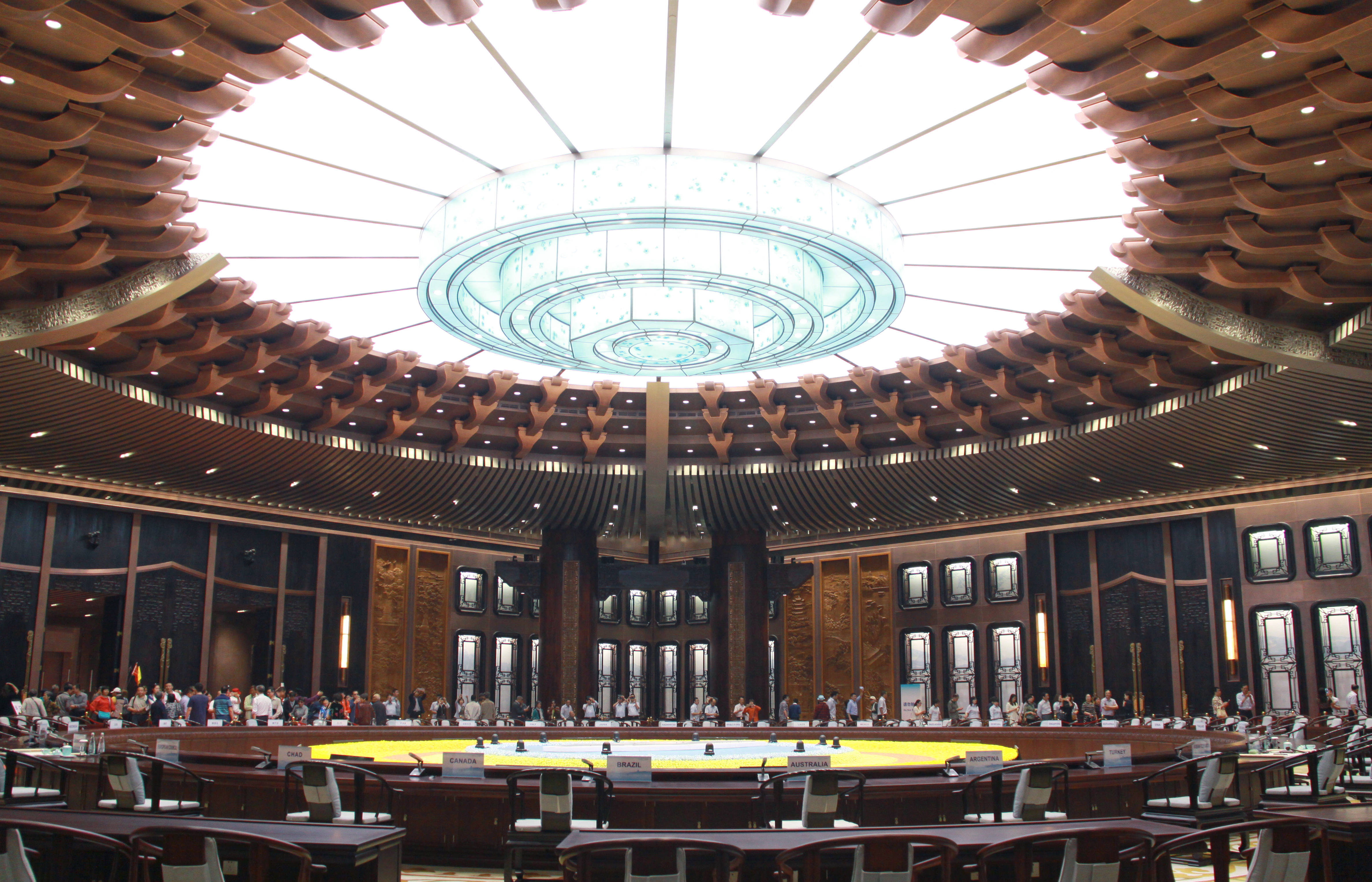杭州国际博览中心共有五层,是集会议、展览、酒店、商业、写字楼五个业态的综合体。作为G20峰会的主会场,杭州国际博览中心将大气恢弘的国际气势与婉约儒雅的江南风情巧妙融合,是中华传统文明与现代文明碰撞、交融的结晶。