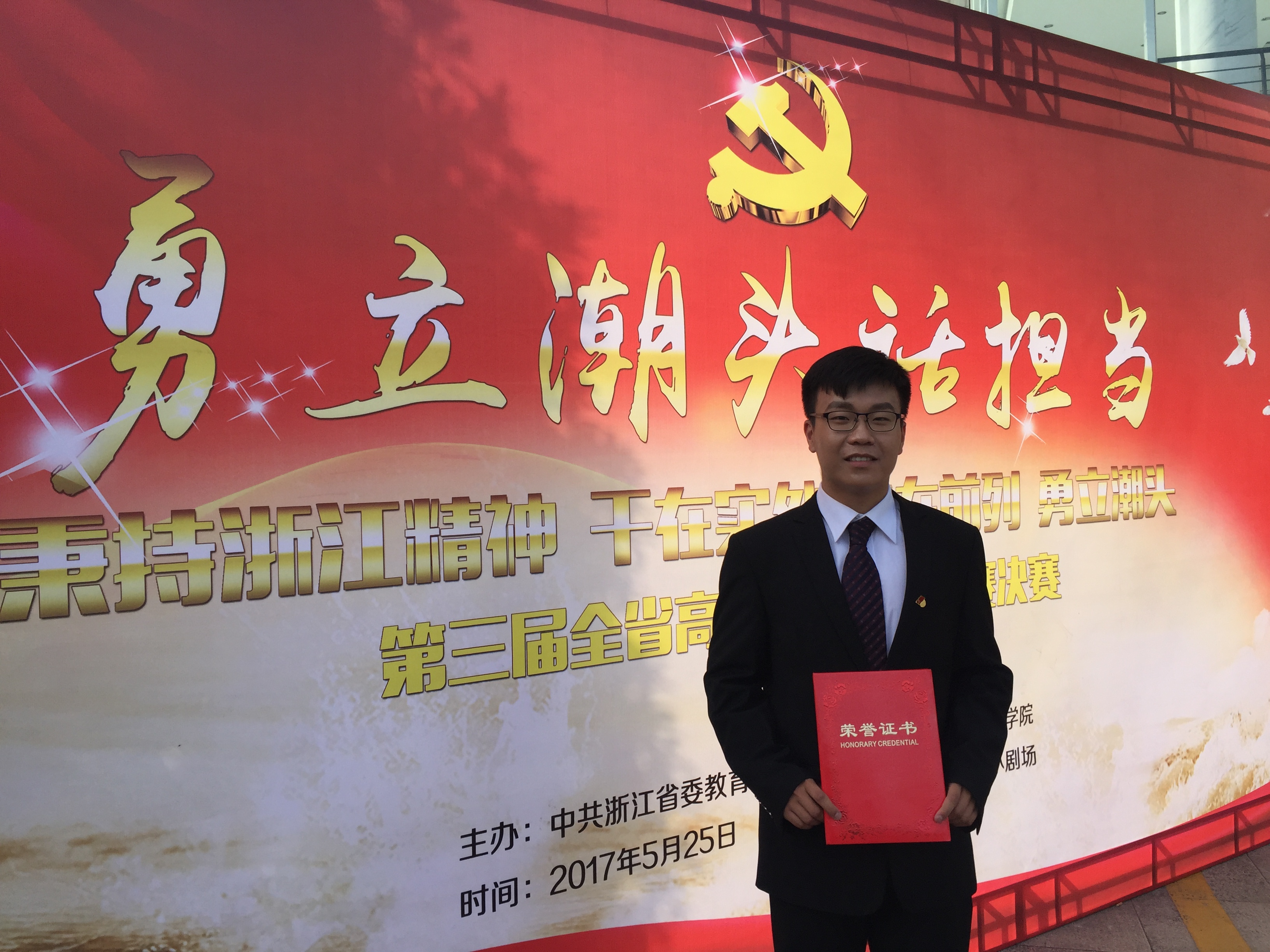 5月25日下午,第三届浙江省高校微型党课大赛在浙江传媒学院举行。本次比赛以“勇立潮头话担当”为主题。全省共有九十余所大专院校参加此次比赛,经过各高校推荐、专家组评审,共有17位教师和2位学生晋级此次决赛。我院本科生崔文康,在现场展示了“红色精神代代传”的主题微型党课,凭借出色的表现,取得第6名的好成绩。