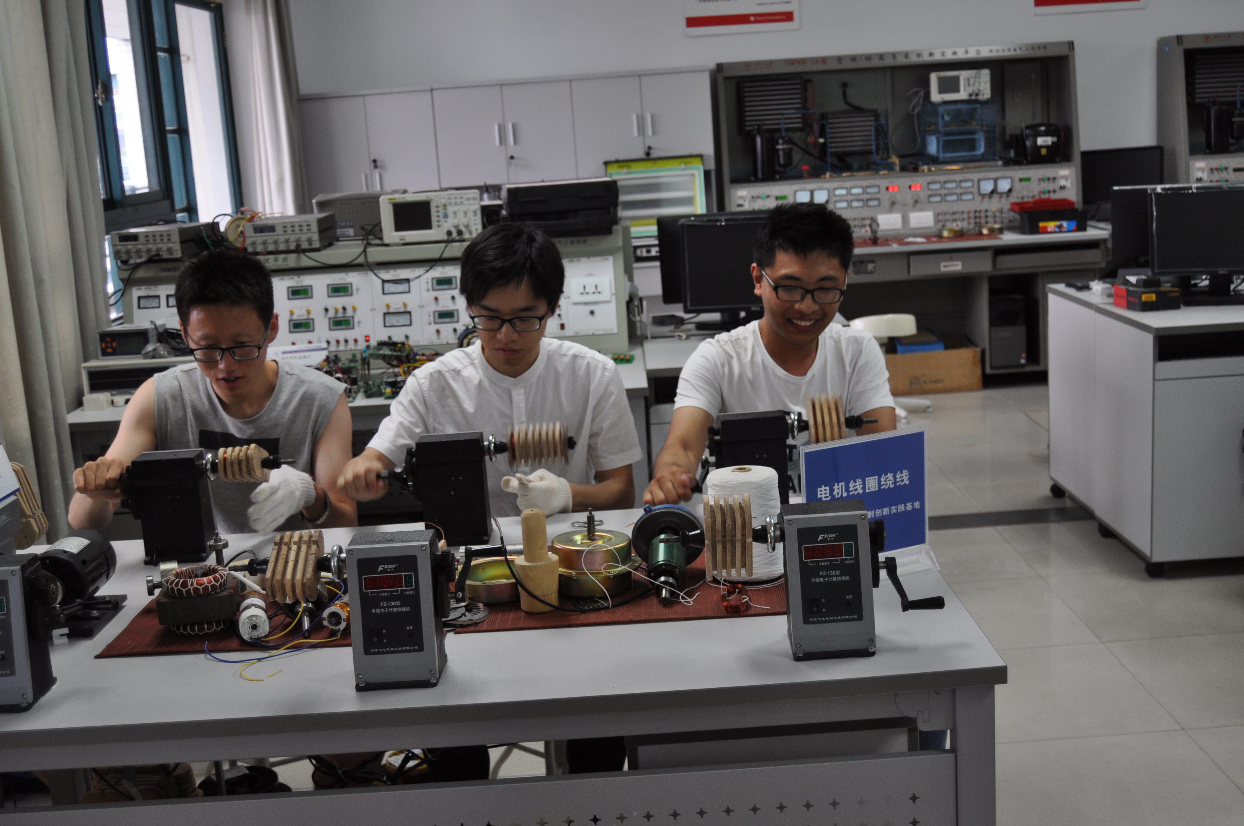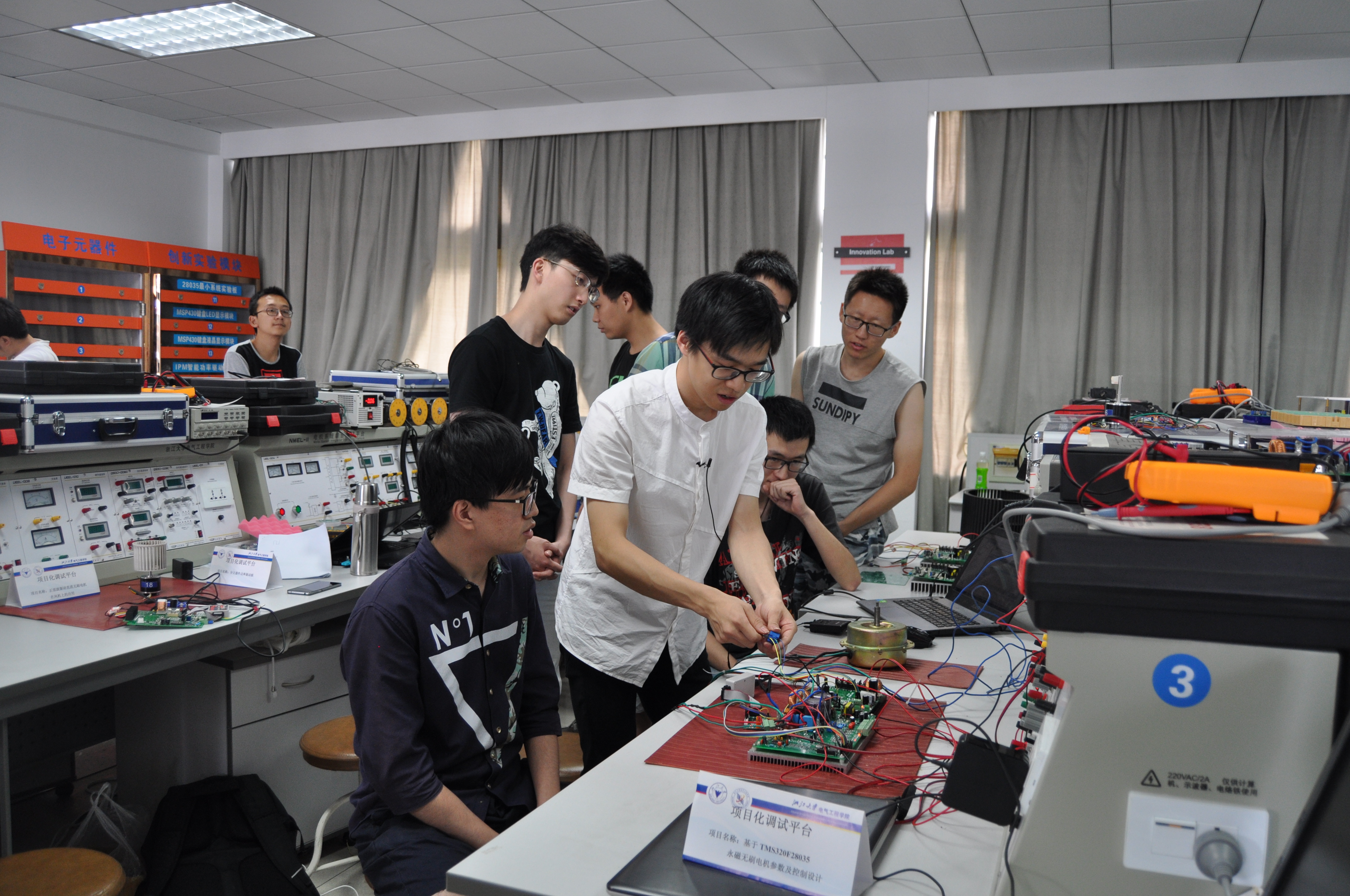 有了这份“见面礼”,项目组的同学们就有了前行的指路灯。但研发过程中的艰辛,却远远超出了他们的预想,大到项目方向的宏观把控,小到一个线圈的绕线、一个器件的焊接,都需要项目组的同学亲力亲为。这也是卢老师一直强调的,“我们不仅要培养会软件的大学生,更要培养会搞硬件的工程师”。在卢老师的演示、指导下,同学们也从最初面对“百线缭绕”的板子的无所适从,从拿起焊枪的磕磕绊绊,从调试实物的百爪挠心渐渐找到了感觉,都像“打了鸡血”一样心无旁骛地为着项目目标而努力。无数个夜晚,项目组的同学都沉浸在硬件设计、控制算法、实物调试中,废寝忘食。“浙大牌油烟机”项目组的谢同学说,项目研发的过程中,他简直变成了“鸽子王”,常常是约了同学去看夜场电影,却因为一次关键的调试没有完成,因为被卢老师坚守在岗位的陪伴指导所感动,最后选择继续埋头苦干。