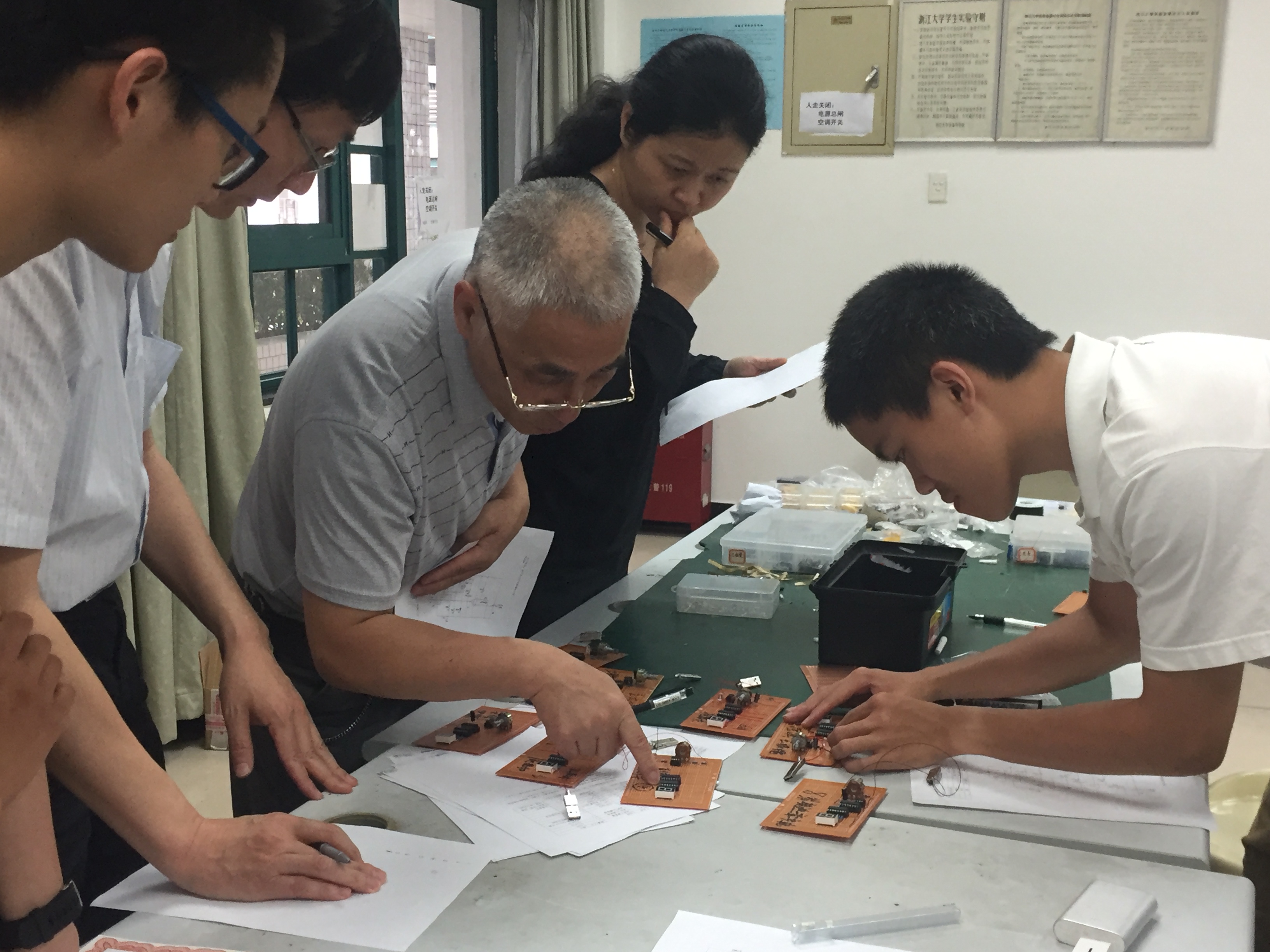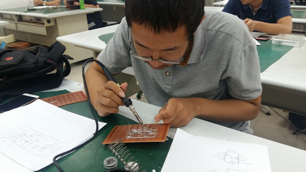 在宣布比赛正式开始后,我们发放了比赛题目、焊接设备及元件后,同学们迅速进入了状态。大家或伏案画着电路图,或用剪刀认真地分割着导线,或拿着电烙铁专注地焊接。对照原理图,讨论焊接步骤,熟悉元件,对元件定位。队员之间配合默契。现场气氛紧张而热烈。