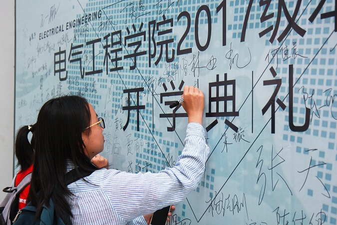 临水报告厅外,17级本科新生们在签名墙上写下姓名留念。临水报告厅内,一段精彩的暖场街采视频后,新生开学典礼正式开始。奏唱国歌后,一段精彩沙画视频带领大家回溯了beat365平台唯一官网悠久而辉煌的历史,近百年的办学历程沉淀的是电气人对“求是创新”校训的坚守和初心。