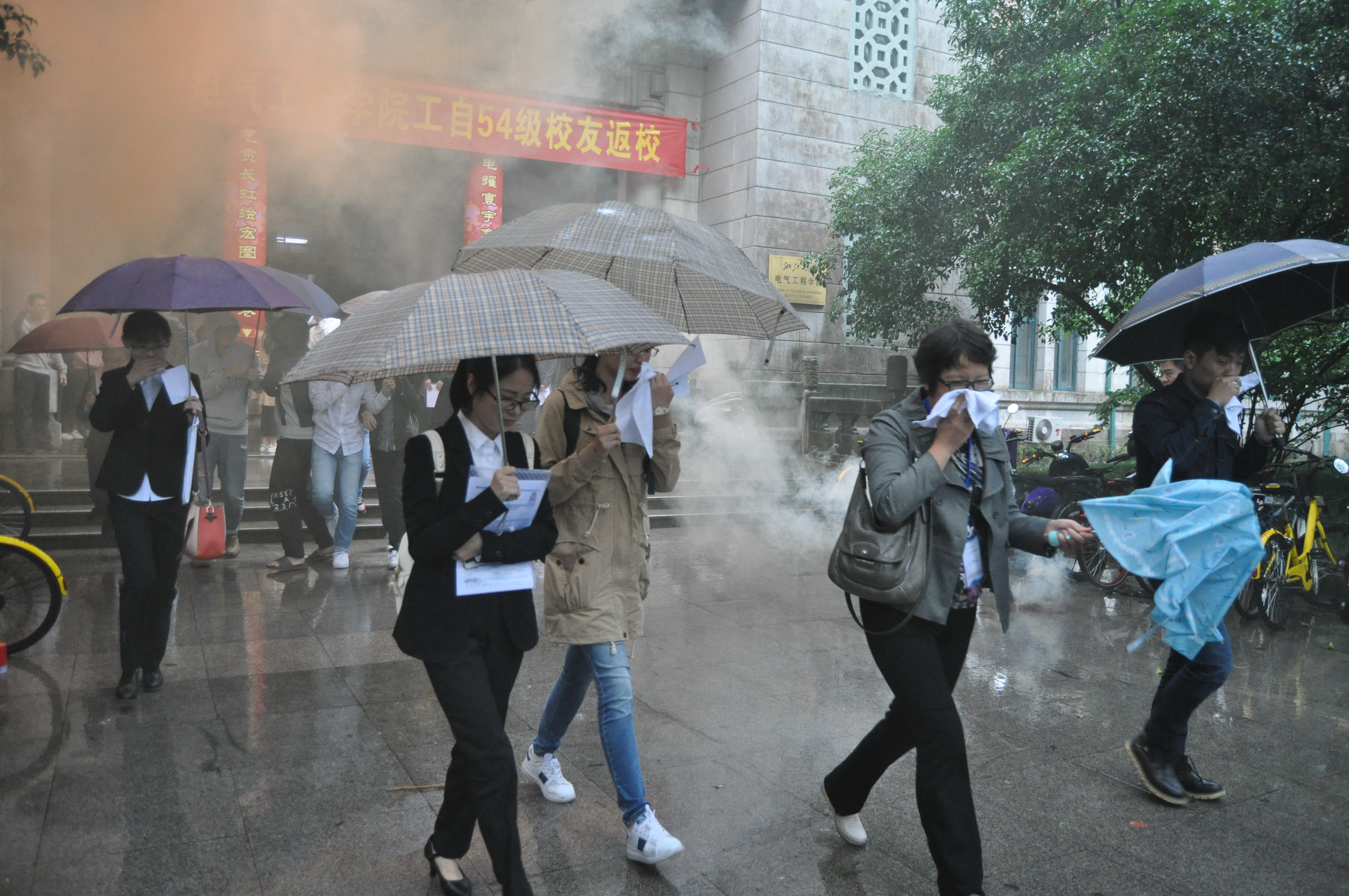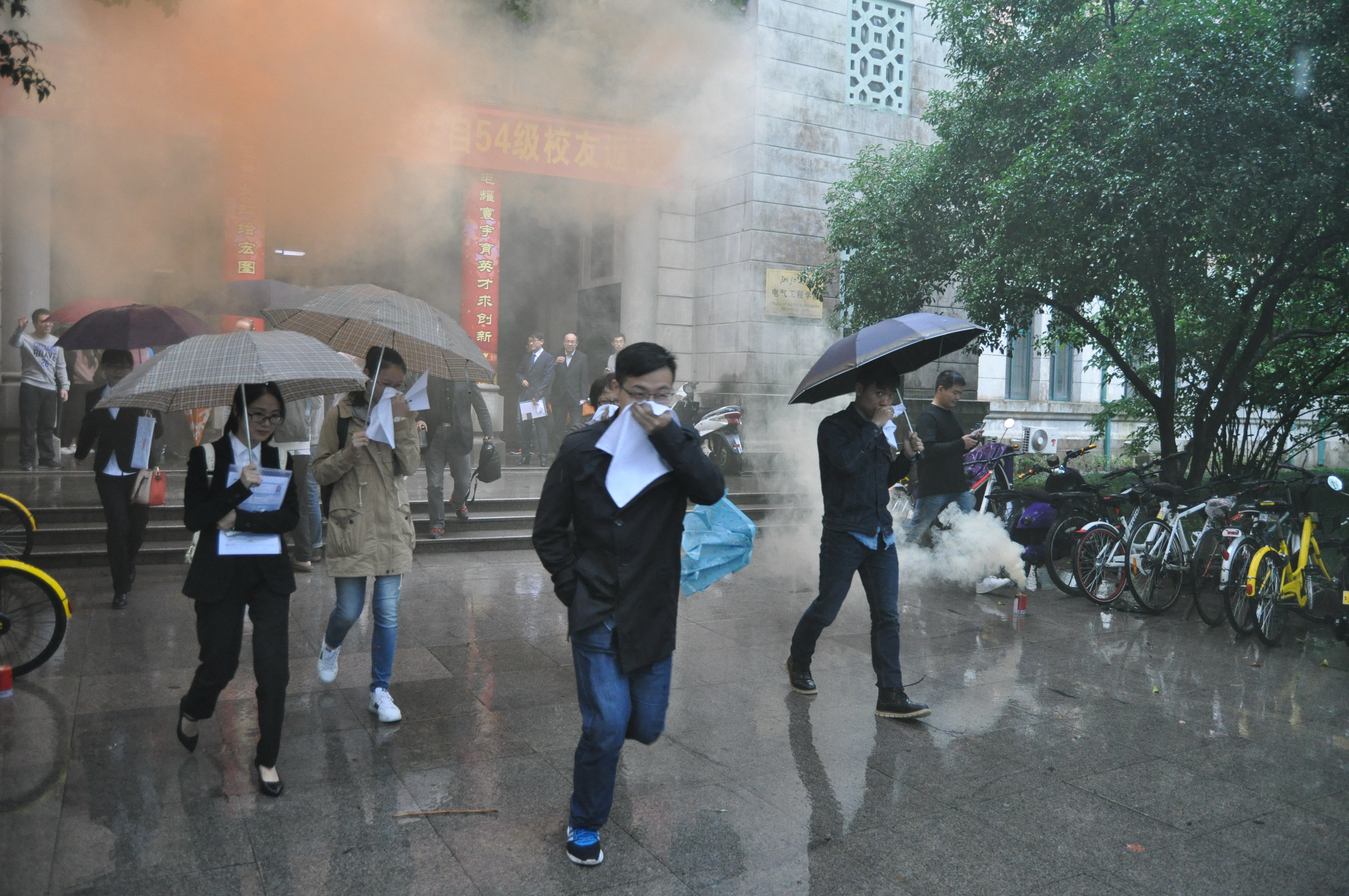 下午二时许,演练工作人员点燃了烟雾弹,浓烟迅速在教二蔓延,急促的警报声响彻大楼。教二的师生第一时间做出反应,在各楼层安全疏散员的引导下,秩序井然地按照教二安全疏散路线逃离模拟火灾现场,并撤离到指定的安全区域。