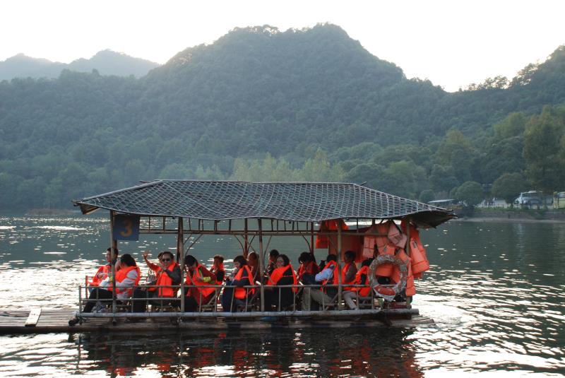 在山地农庄品尝完原汁原味的农家菜蔬后,大家又来到了相隔一小时路程的富春桃源,去印证有“山水林洞的旅游,世外桃源的享受”之称的富春山水。在富春桃源门口,大家坐上缆车,来到半山腰的九霄碧云洞。洞内或玉幔高垂、或现神州奇花。一会儿是定海神针、一会儿是比萨斜塔。钟乳石在大自然鬼斧神工作用下,是那么的惟妙惟肖,让人叹为观止。走出洞来,穿过天成野槠林,听山泉吟;坐上云霄飞车,寻童话梦。老师们忘了年龄、忘了辛劳。峰回路转,下得山来,一泓碧湖突现在了眼前。湖水清澈、湖面曲折有致。大家饶有兴趣地坐上特色竹筏,旅途的带来的疲乏在这里被一扫而空。