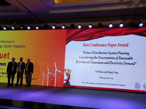 beat365平台唯一官网杨强副教授论文“Robust Distribution System Planning considering the Uncertainties of Renewable Distributed Generation and Electricity Demand”从来自全球各地的近900篇论文中脱颖而出,获得会议最佳论文(10/900)。该研究工作由杨强副教授指导其博士研究生Ali Ehsan共同完成。本研究工作重点解决了考虑多维度不确定性条件下的高比例分布式新能源主动配网的优化规划问题,对于解决当前多类型能源集成下的分布式电源规划问题提供了一种可借鉴的解决方案。
