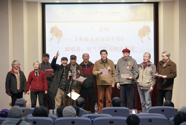 离退休工作研讨会结束后,学院离退休教职工们准备了丰富的文艺活动。今年,学院迎来了一位九十大寿、十三位八十大寿的耄耋老人,他们分别是胡中楫、张杰官、方明刚、魏鼎、吴兆麟、邵金水、陈立铭、陈惠君、黄蒨蒨、尚功泰、郑家龙、姚玉明、刘保墉、求菊如。王瑞飞书记发表了热情洋溢的贺辞,并与寿星合影留念。