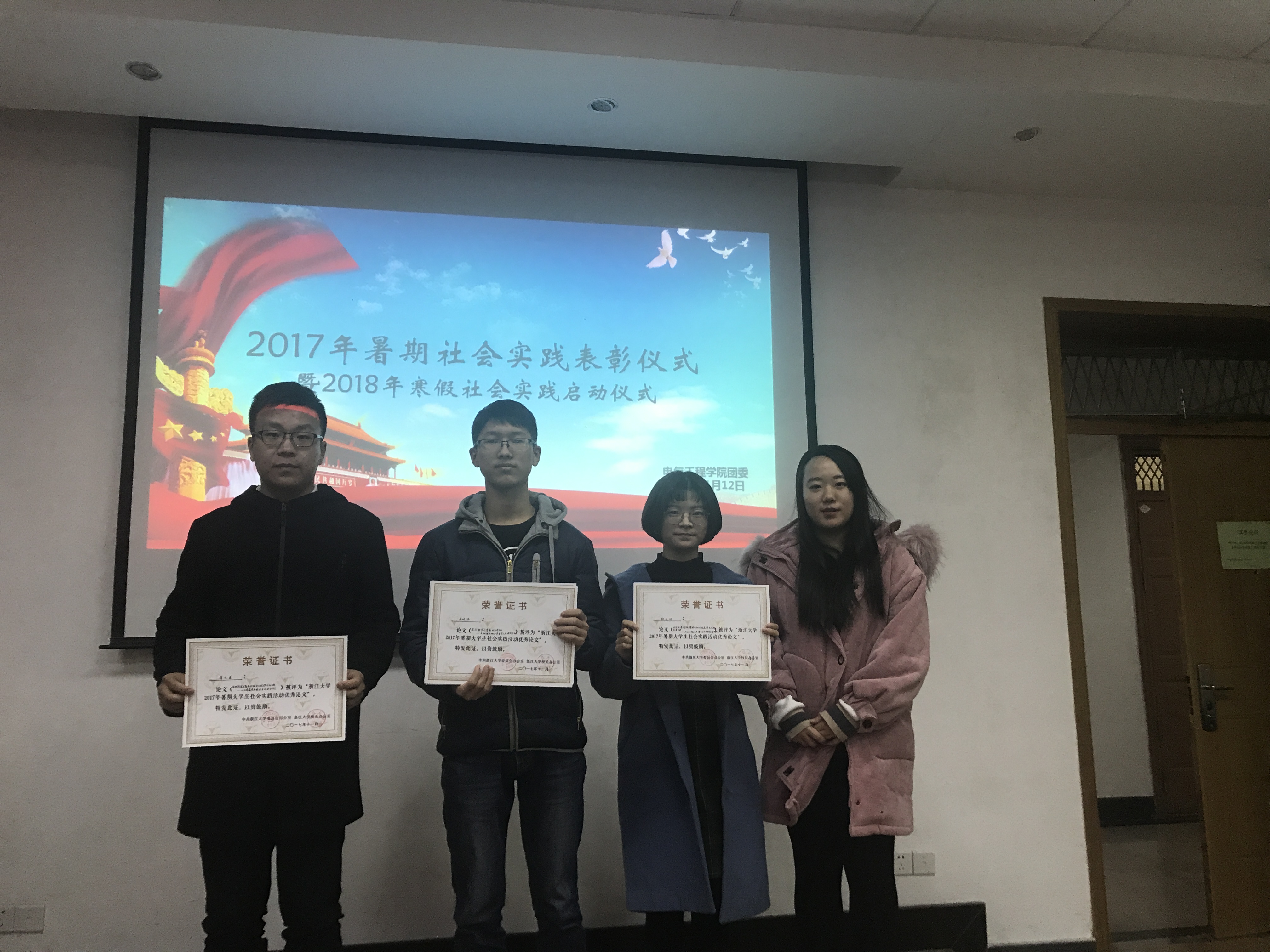 1月12日下午,beat365平台唯一官网2017年暑期社会实践表彰暨2018年寒假社会实践启动仪式在教二121举行。团委副书记李涛老师、李济沅老师和张竞文老师以及暑期社会实践优秀团队、先进个人获奖代表和寒假社会实践各队伍负责人参加本次会议,会议由学院团委社会实践指导中心副主任陆浩聪主持。