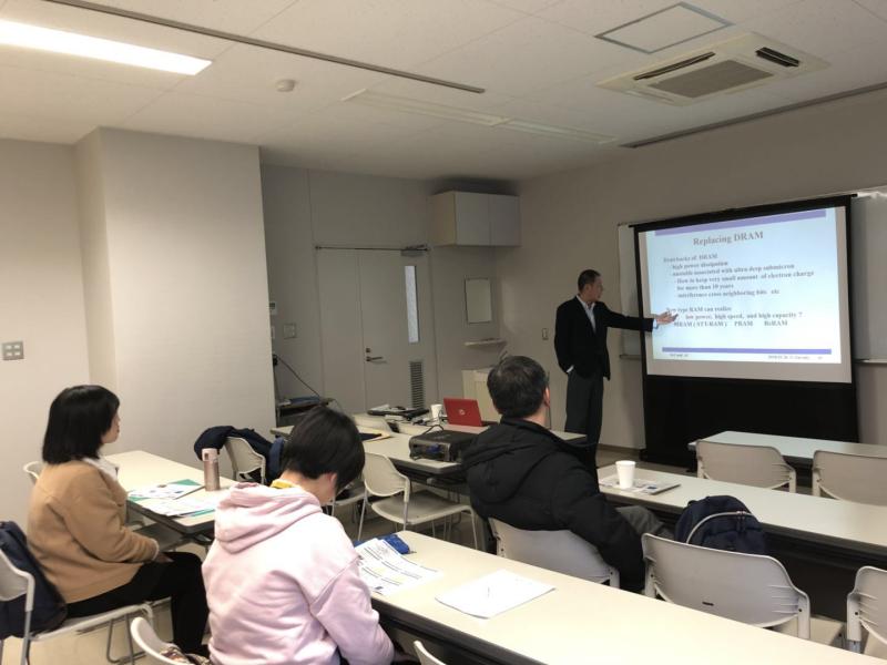 2月27日下午,保坂纯男教授结合自己的研究成果向访学团介绍了利用电子束绘图的纳米级制造技术,该技术可以应用在超高密度存储器的制造中。之后,保坂教授又介绍了从光学显微镜到电子显微镜再到扫描隧道显微镜(STM)的演变过程以及这三种显微镜的工作原理。STM显微镜也被利用到超洁净表面原子的移动,采用原子构造特定的logo,实现人类对原子的操纵。