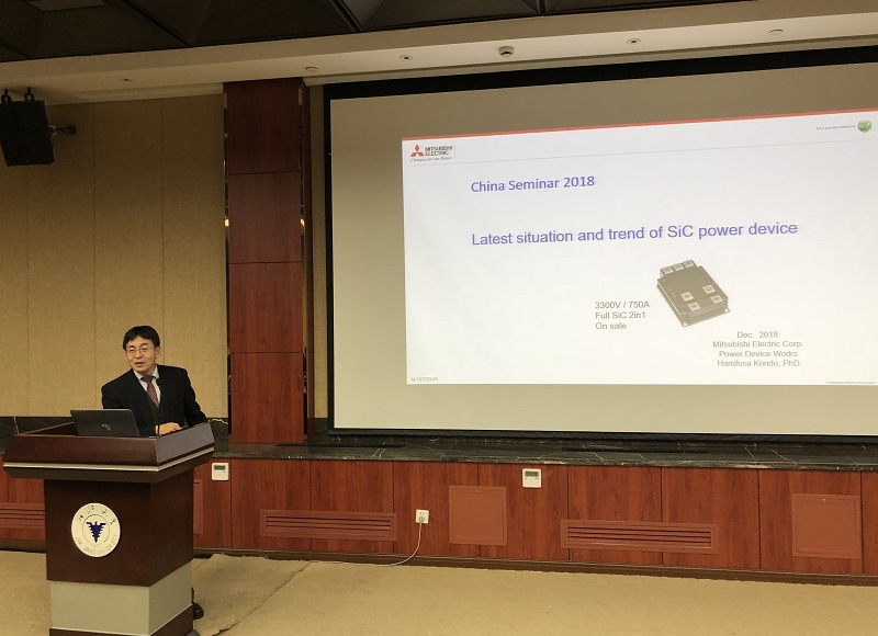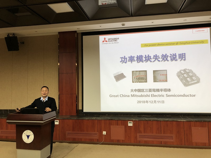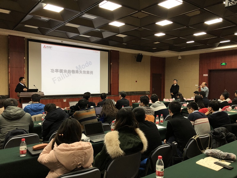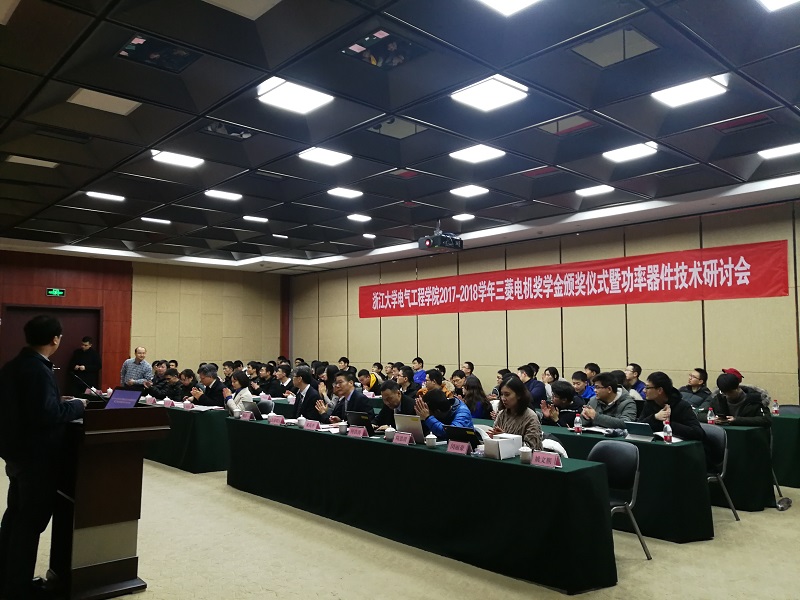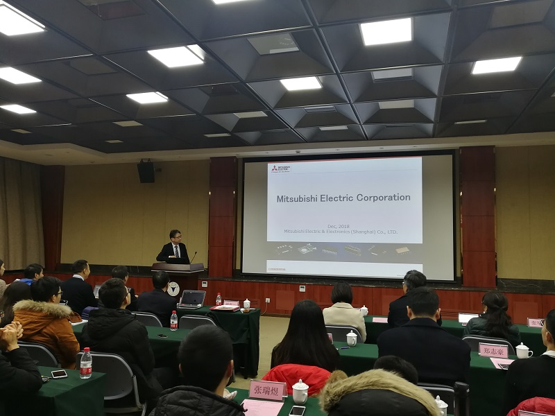 颁奖典礼结束后如期举行了三菱功率器件技术研讨会。楠真一先生先简要介绍了三菱电机半导体公司的历史、发展现状和产品结构。之后近藤晴房博士和何洪涛先生分别做了SiC功率器件的最新现状及发展趋势和功率模块失效模式分析的讲座,并与师生进行了广泛的交流和互动。至此,颁奖典礼与研讨会圆满结束。