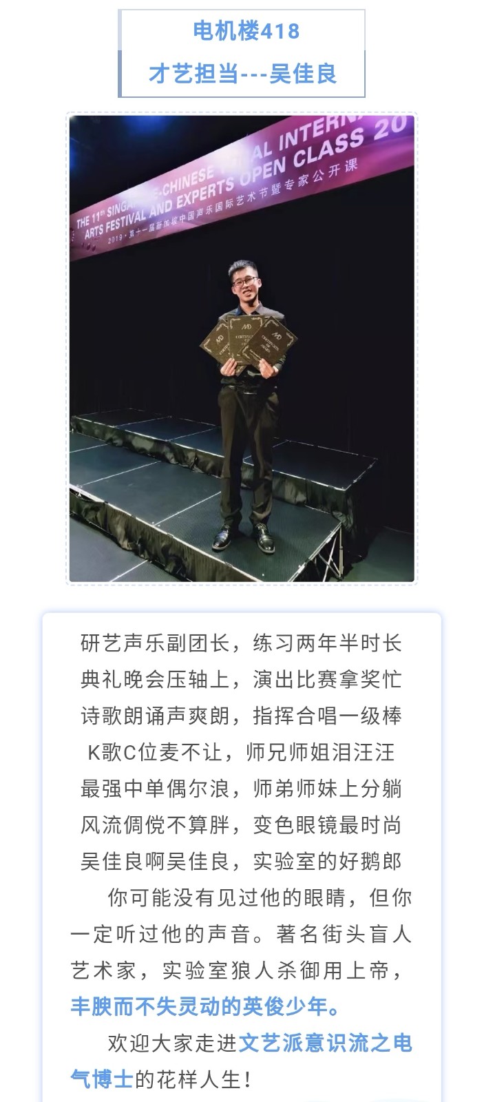 为展现各实验室成员的风采,活动还面向参评实验室开展了系列文稿征集。文稿征集活动分“实验室门面担当”、“实验室才艺担当”和“实验室专属之最”三个组别。“实验室门面担当”展现了各实验室被冠以“论文印刷机”、“实验室永动机”、“科研扛把子”等称号的成员风采。“实验室才艺担当”分享了实验室身怀绝技的同学,文有唱歌指挥说相声,武能长跑卧推做深蹲。各实验在“实验室专属之最”组别的表现更是花样百出,“实验室最会玩”、“实验室球女王”、“桌游达人”……将实验室成员的个性展现得淋漓尽致。最终以下同学获得实验室之最称号:宇航级工艺代言人——孙宇航(172票);才艺担当——吴佳良(129票);最暖小师弟——甘泉(176票)。