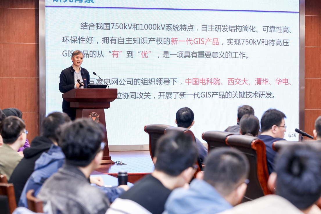 聘任仪式后,陈维江院士应邀作题为“新一代超/特高压金属封闭组合电器(GIS)”的学术报告,向师生介绍了我国气体绝缘金属封闭开关电器(GIS)的研究背景、紧凑化断路器的创新优化设计、紧凑化隔离开关VFTO的抑制方法以及特高压GIS新型母线的研究成果。陈院士的报告深入浅出,所展示的大家风采令在场师生印象深刻。陈院士以需求牵引科研导向,立足于技术攻关,16年来攻坚克难获得了丰硕的科研成果,他严谨的科学态度和执着坚持的研究精神值得每一位师生学习。