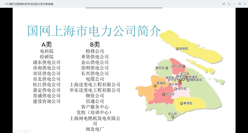 学长从更为实际的角度对国网上海市电力公司下辖的几个子公司作了详尽的分析,根据工资收入水平、房价和生活成本等进行利弊权衡,使同学们有了更直观而深刻的认识。接下来学长解释了国网上海市电力公司提前批招聘的流程,并分享了亲身实践的笔试面试小技巧:结合自身条件填写志愿、行测时放松心态、笔试尽量多准备等。