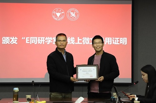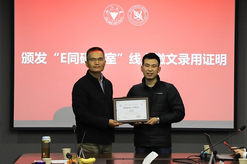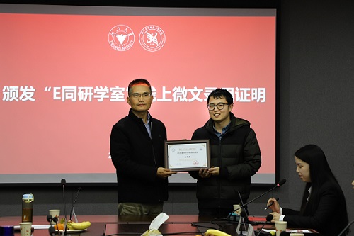 beat365平台唯一官网副院长郭创新为前三期微文录用者颁发“E同研学室”线上微文录用证明。