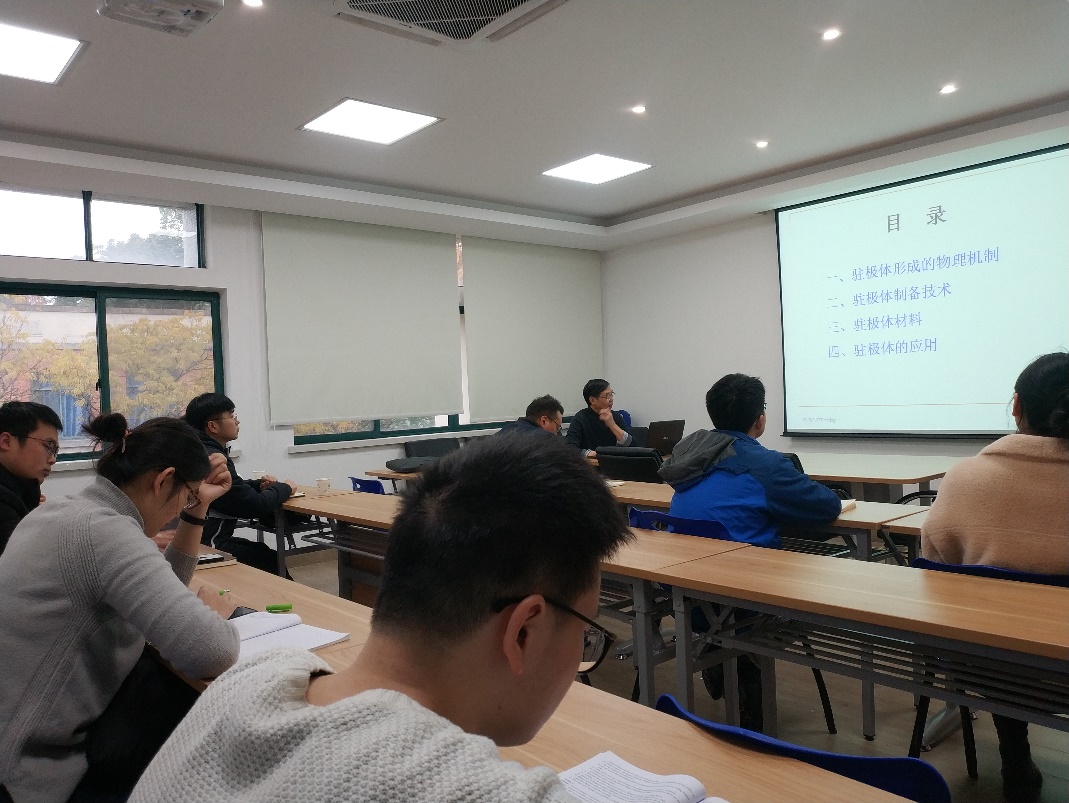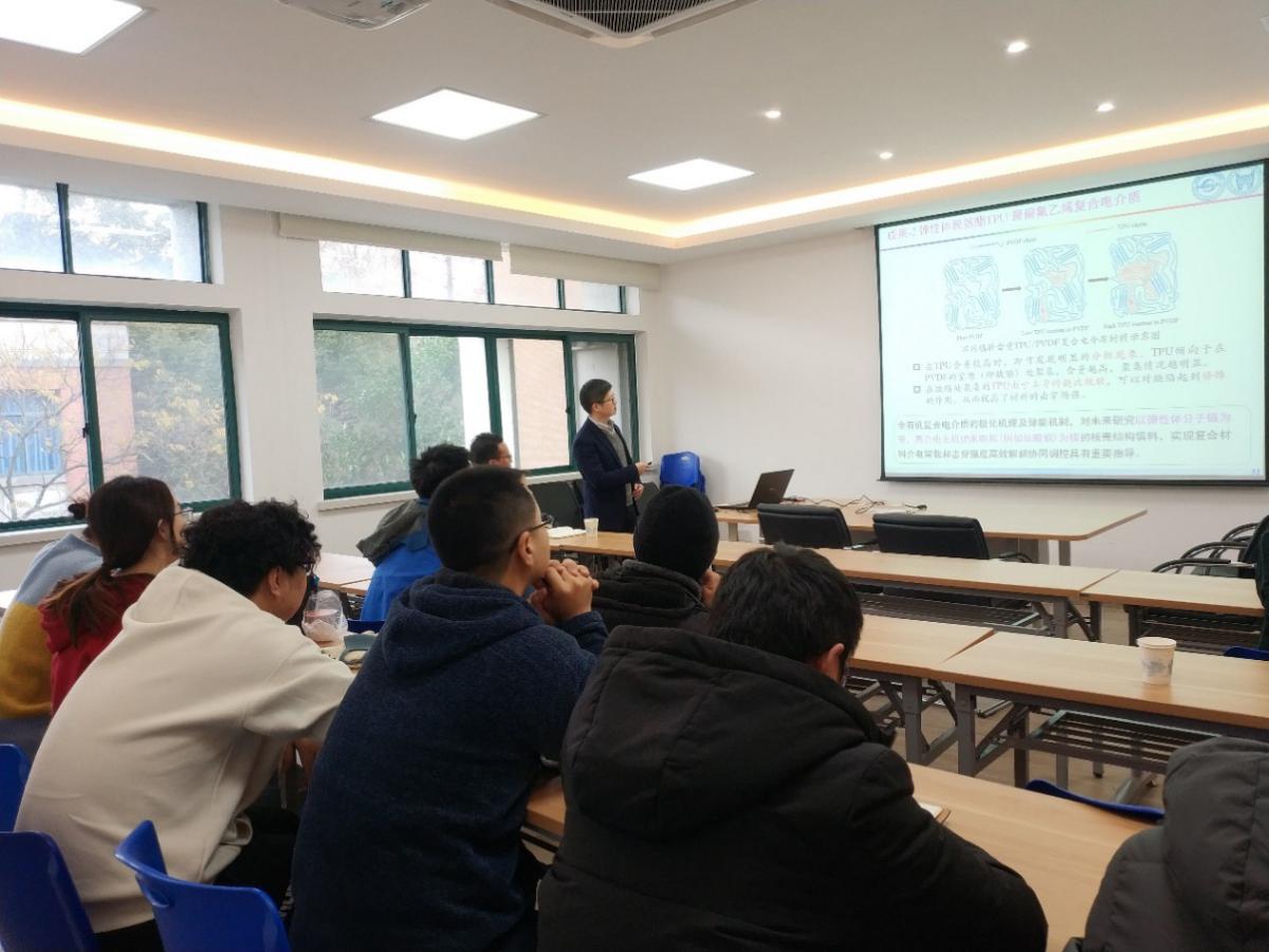12月11日上午,陈钢进教授做了题为“驻极体材料、器件及应用”的学术报告,报告系统介绍了驻极体的基本概念,驻极体材料的发展概况,驻极体材料发展面临的挑战和课题等。陈钢进教授从电介质功能材料的起源、驻极体材料的提出、驻极体储能的原理、驻极体材料的发展情况和对驻极体材料的展望等方面深刻分析了当下驻极体材料发展的形势与背景,结合国际能源需求和目前疫情情况,阐述了驻极体材料可以应用在多个领域,包括微型电子器件、医疗口罩生产、生物医学研究等未来重点领域,驻极体材料的发展需要更多深入的研究和大量年轻生力军的支持。在报告后的讨论环节,陈钢进教授热情地和同学进行交流,从专业的角度回答了同学的问题并给同学们提出了自己研究领域的建议,同学们受益匪浅。