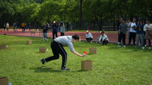 本届运动会积分赛共设立投弹比赛、绑腿行军、红军过草地、送鸡毛信、扫雷接力、踢毽子六个正式比赛项目,每个比赛项目按照积分制形式对前八名依次计分,最终按照每支队伍的总分排出比赛名次。项目设计将红色元素融合其中,师生在团结协作中,重温我们党在这一百年中走过的风雨。投弹比赛项目中,模拟战场上的投弹手,队员们用沙包瞄准靶纸,抛出优美的弧线命中靶心;绑腿行军项目中,大家喊着“一二一二”的口号,通过练习,从互相搀扶到奔跑向前;红军过草地项目中,运动员协同合作,传递四个垫子拼接前进,避免陷入“沼泽地”;送鸡毛信项目中,队员用筷子夹起乒乓球跑向对面,顺次接力,既要保证速度,又要保持平衡;扫雷接力项目中,模拟战场扫雷插旗标注,队员们在多个点间寻求最佳路线,将小旗依次放入盒子中;踢毽子项目中,队员们默契合作,灵活流畅的配合让人惊叹,引来阵阵喝彩。