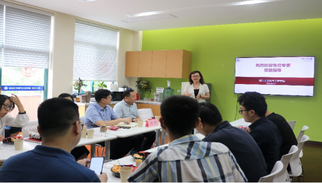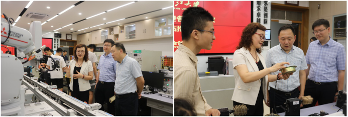 随后,老师同学们移步至学院教工活动中心,卢慧芬老师系统地介绍了机电类专业国家级实验教学示范中心以及基于实验中心开设的课程情况。一方面,在课程建设中发挥机电学科优势学科的特色和优势,组建跨学科项目平台,将最新的科研成果直接或间接地引入到实验教学中,让学生从一个系统工程的角度,培养工科大类学生跨学科知识综合运用和实践动手能力,增强学生分析问题、解决问题的科研能力;另一方面,建立和完善了立体化的实验教学体系,形成“模块创新-算法创新-应用创新”递进式的培养路径,将创新能力的培养融入实验教学的每个环节、每个实验、拾级而上、循序渐进,渐次提升实践技能和创新意识。卢老师还重点介绍了工程项目化教学的具体实施方法和流程,在项目化教学过程中,学生基于自身能力和兴趣来选择具体工程项目。在教学过程中,学生可能会遇到很多难题,产生畏难情绪。此时,老师除了要及时给予必要的帮助之外,更要以身作则,树立不怕困难,奋力拼搏的形象,给学生以信心。课程中还设置了自动化生产线参观等环节,增加了教学的趣味和生动性。
