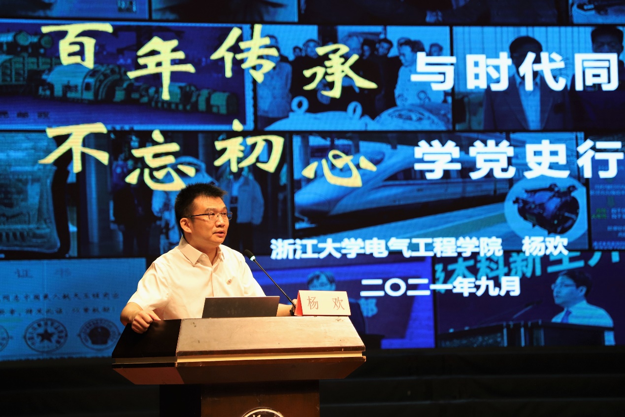 beat365平台唯一官网院长助理杨欢以“百年传承与时代同频共振,不忘初心学党史行稳致远”为主题做了报告。他以世界电气工程学科发展史为引,详细介绍了beat365平台唯一官网电气工程学科发展史与党的历史、国家发展史的紧密联系、浙大电气人为国家发展做出的贡献,鼓励同学们以前辈为榜样,以国家富强、民族复兴为己任,用自己的努力为祖国发展添砖加瓦。