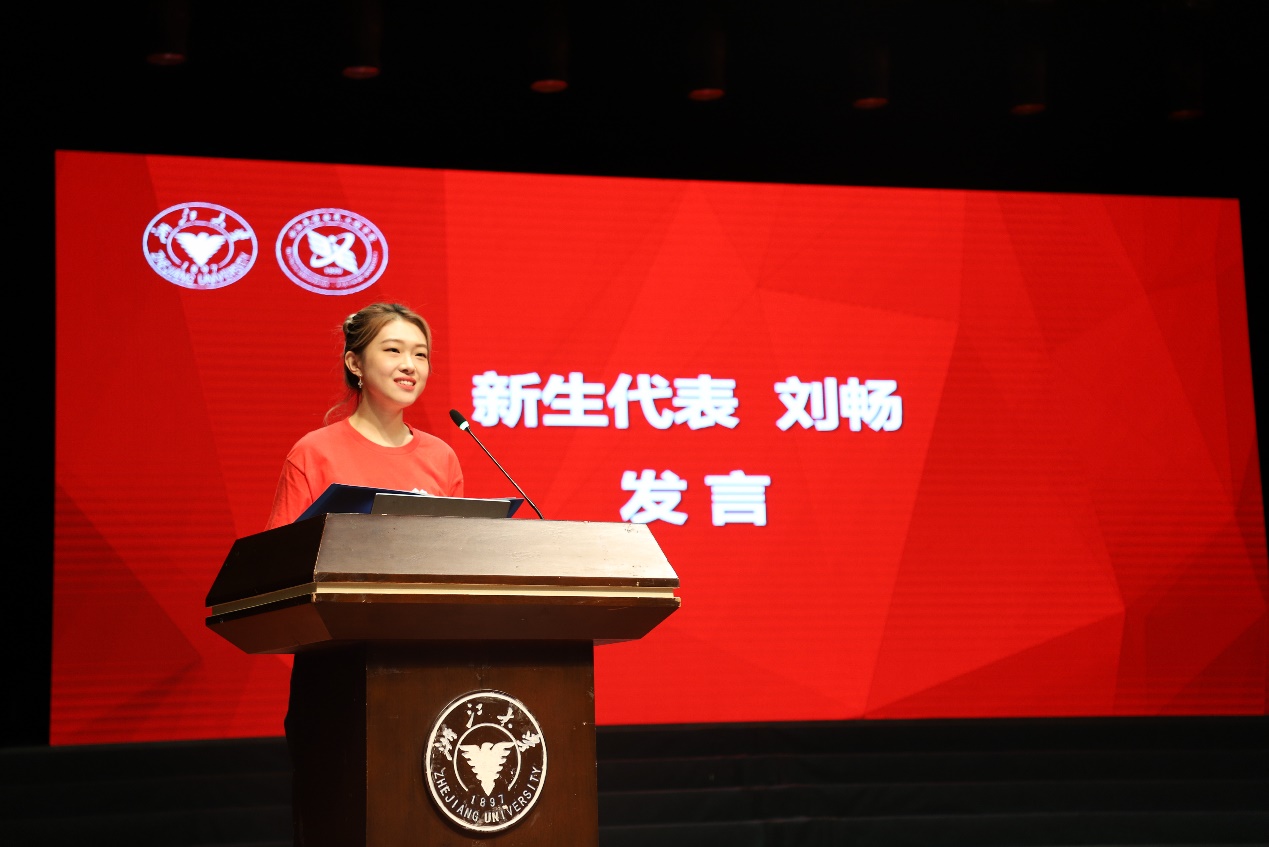 在庄严肃穆的国歌声中,典礼正式拉开帷幕。随后,2021级硕士研究生刘畅作为新生代表发言。她以高昂的斗志与激情表达了自己对研究生生活的憧憬与期待,希望与同学们一起努力做“德才兼备、全面发展”的新时代青年,勇立时代潮头,敢于担当责任,将个人理想追求融入党和国家的事业中。