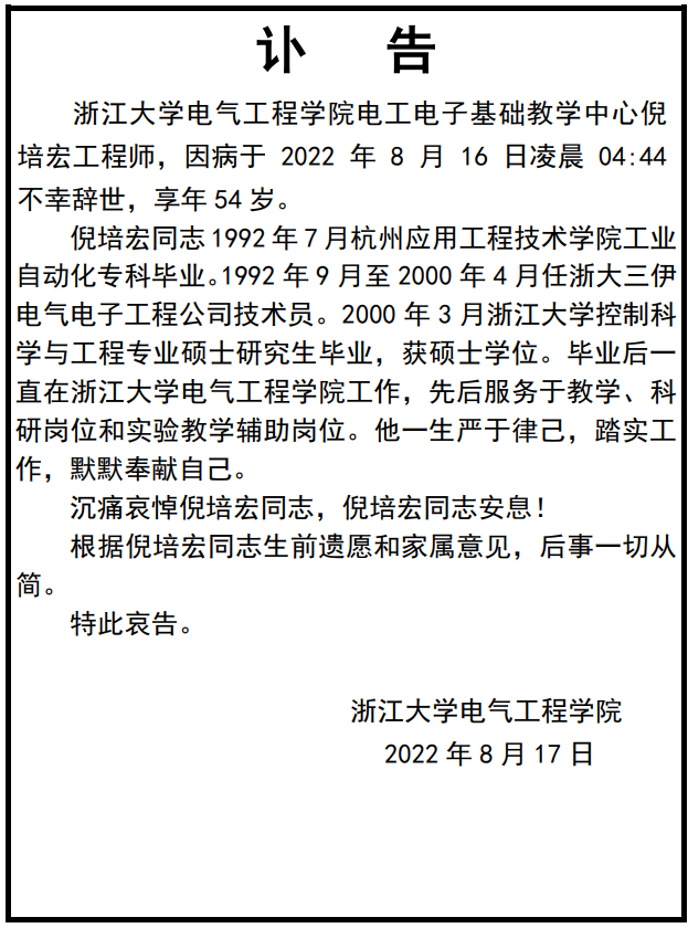 倪培宏老师讣告
