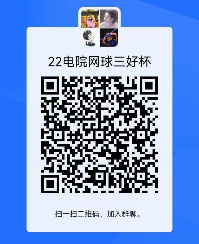 请有相关特长或有兴趣参赛的同学按下列报名规则在学院层面报名:请扫描下方二维码加入网球赛咨询群并填写问卷报名,截止时间为2022年11月25日24:00。报名后学院将在统一整合后尽快确定团体赛及单项赛队员及其参赛项目,参赛队员需开具校医院健康证明。
