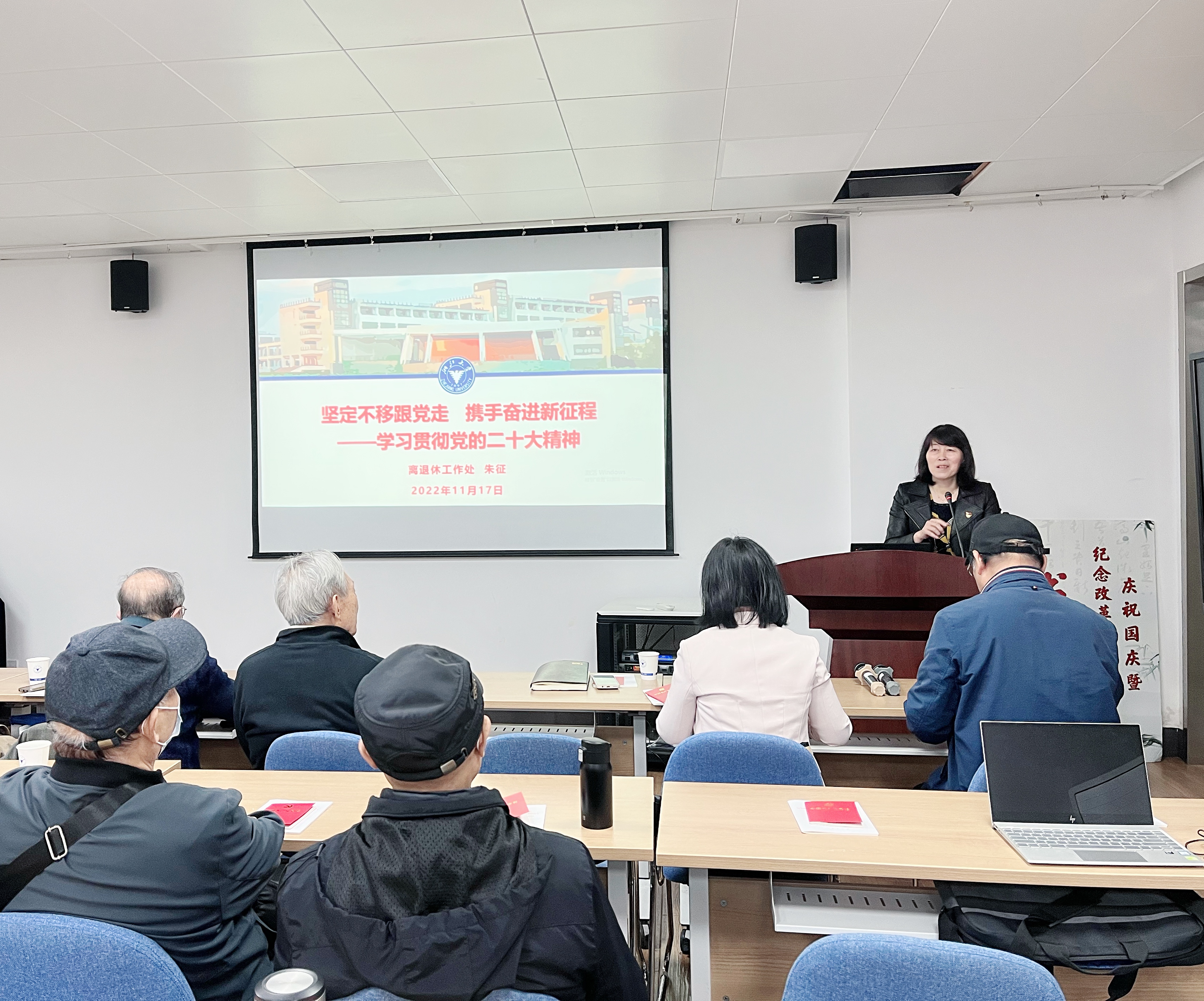 为深入学习宣传贯彻党的二十大精神,凝聚离退休党员干部的思想共识,11月17日,beat365平台唯一官网离退休党总支组织开展学习贯彻党的二十大精神专题党课讲座,邀请beat365平台唯一官网离退休工作处处长朱征对大会精神进行宣讲。讲座由离退休党总支书记吴国忠主持。