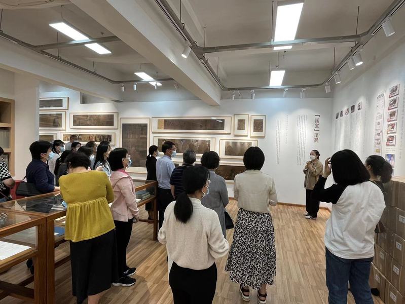 跟着讲解员的步伐,支部党员群众怀着好奇心和历史敬畏感,近距离地了解这些绘画作品的风采神韵和其背后的历史故事。《柳鸦芦雁图》、《摹张萱捣练图》、《千里江山图》...一幅幅画作,让大家惊叹绘画的惟妙惟肖,寻找到时空对接的共鸣。纸寿千年,墨色苍润。两支部教工随意翻阅《先秦汉唐画全集》、《宋画全集》、《元画全集》、《明画全集》及《清画全集》,在逐幅欣赏画作之余,心中的民族自豪感油然而生,更加深刻体会到中华优秀传统文化的瑰丽想象和博大精深。