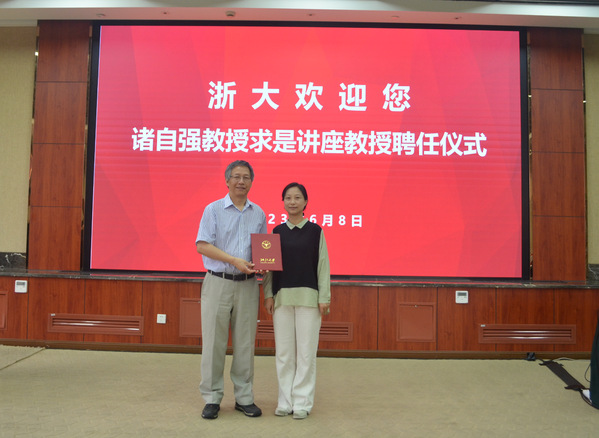 学院党委书记汤海旸为诸自强教授颁发求是讲座教授聘书。