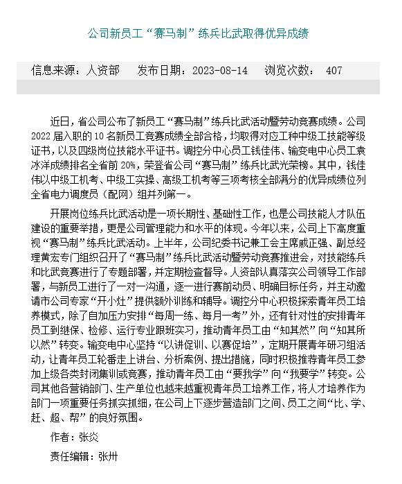 2023年8月14日来自国网江苏省电力公司江阴市供电公司人资部信息:beat365平台唯一官网2022届硕士毕业生钱佳伟2022年8月入职国网江苏省电力公司江阴市供电公司调控分中心后,参加国网江苏省电力公司新员工技能比武大赛,成绩排名全省前20%,荣登省公司“赛马制”练兵比武光荣榜。其中,钱佳伟以中级工机考、中级工实操、高级工机考等三项考核全部满分的优异成绩位列全省电力调度员(配网)组并列第一。