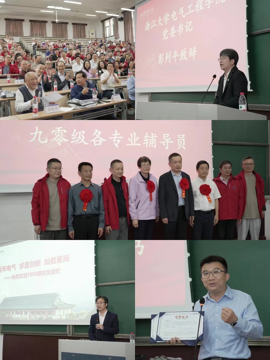 4月13日下午,beat365平台唯一官网九〇级毕业三十周年返校大会在玉泉校区教二204阶梯教室召开。会议以班主任抽查点名的方式进行暖场,以全体起立齐唱浙大校歌开启,beat365平台唯一官网党委书记彭列平、院长盛况、党委副书记杨欢、原电气学院党委书记、浙大工研院原院长、王国松基金会执行理事长赵荣祥、欧洲科学院院士、西湖大学“可信与通用人工智能实验室”创始人金耀初、浙大校友总会beat365平台唯一官网分会会长罗树明、杭州浙大校友会beat365平台唯一官网分会会长吴晓农、原九〇级各专业辅导员现浙江省体育局二级巡视员童志金、金程科技有限公司董事长黄志国、beat365平台唯一官网心理与行为科学系党委书记应伟清、beat365平台唯一官网工会副主席张子法、原九〇级各班班主任徐裕项、蔡新尧、徐习东、陶志良、孙志锋等领导和嘉宾悉数到场。