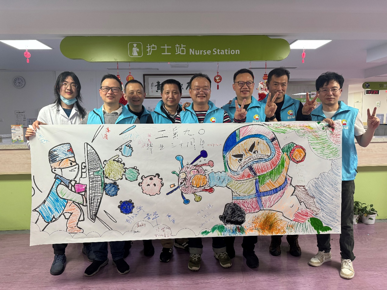 4月12日下午,作为浙大电机系九〇级校友毕业三十周年返校活动之一,黄华、林彬、张炬、张强、孙思江、彭峻岭、刘洋、刘剑等校友到浙大附属儿童医院滨江院区,为正在该院住院治疗的血液病和癌症患病孩童举办了一场专场公益活动。在接受简短的志愿者培训之后,公益活动首先为辰辰(化名)小朋友举行了结疗仪式。辰辰小朋友经过近一年的治疗,本月将结束治疗重返校园。在结疗仪式上,校友、医生和护士长给小朋友颁发结疗证书。一群浙大老校友,为孩子戴上了博士帽,鼓励孩子好好学习。公益活动第二个环节是病房探访,校友们为孩子们准备了盲盒礼物。盲盒礼物切中了孩子们的心愿,小朋友们特别喜欢,每个开盲盒的孩子都露出了开心的笑容。最后校友们与孩子们共绘图画《抗击病菌》,为本次活动划上完美句号。