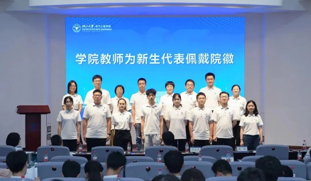 一朝院徽挂胸前,一生无悔电气人,与会德育导师代表共同为新生们佩戴院徽。