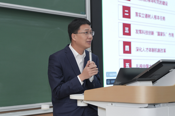 薛其坤院士围绕深入学习贯彻习近平新时代中国特色社会主义思想和党中央部署要求,从“初心如磐使命在肩”“躬耕科研心系家园”“接力奋斗共创未来”三个方面,结合自身科研实践和执教治校体会,分析了当前我国所处的历史方位,阐述了新时代共产党员,特别是党员科技工作者的使命担当和实践路径。他通过讲述钱学森、郭永怀等优秀党员科学家的感人事迹,勉励师生传承“两弹一星”精神,勇攀科技高峰,不负时代,勇担使命。他期许广大教师党员要成为立德树人的“大先生”、师德师风的“引航者”、科研创新的“攀登者”、服务社会的“领头雁”;学生党员要争做坚定信念的“引领先锋”、勤学向上的“示范先锋”、勇于担当的“实干先锋”、矢志报国的“行动先锋”,为实现中华民族伟大复兴汇聚磅礴力量。