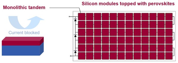 Figure 5: Monolithic perovskite-silicon tandem structure to enhance the reverse-bias stability (left); silicon modules topped with perovskites that can use conventional bypass diodes (right). Source: adapted from Joule 2022.