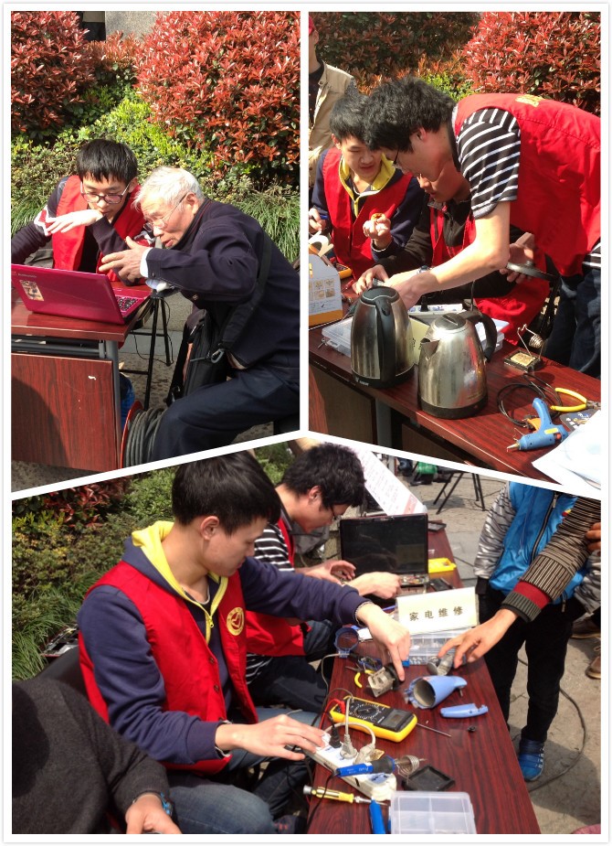 3月28日也是北星社区的便民活动日,学院的电器维修项目也成了社区便民项目的核心部分。由于电器维修项目已在北星社区建立起良好的口碑,前来维修的居民络绎不绝。重装电脑系统与维修电水壶是居民的主要问题,小组成员利用自己学习的理论与实践知识,在烈日下挥洒着汗水,为社区居民贡献着自己的一份力。本次电器维修成果颇丰,维修好苹果充电器,电吹风,电水壶等7件电器,直到活动结束仍有居民前来询问下次何时来,这是对电器维修服务质量的肯定,也是对志愿者付出最好的尊重。志愿者向居民表示日后还回来服务社区居民,奉献社会。