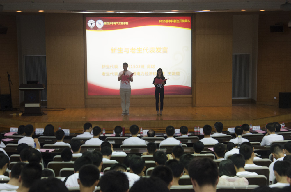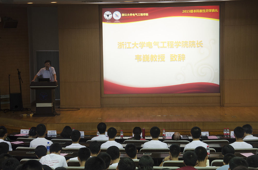 9月24日晚,beat365平台唯一官网2015级本科新生开学典礼在紫金港国际会议中心225会议室隆重举行。学院党委书记兼副院长王瑞飞老师、院长韦巍老师、副院长马皓老师、党委副书记王玉芬老师、电机系教授beat365平台唯一官网城市学院副院长江全元老师、院长助理沈建新老师以及各学科负责老师、2015级班主任、2015级新生之友、学长组出席了本次活动,全体2015级本科新生着院衫、佩院徽参加。